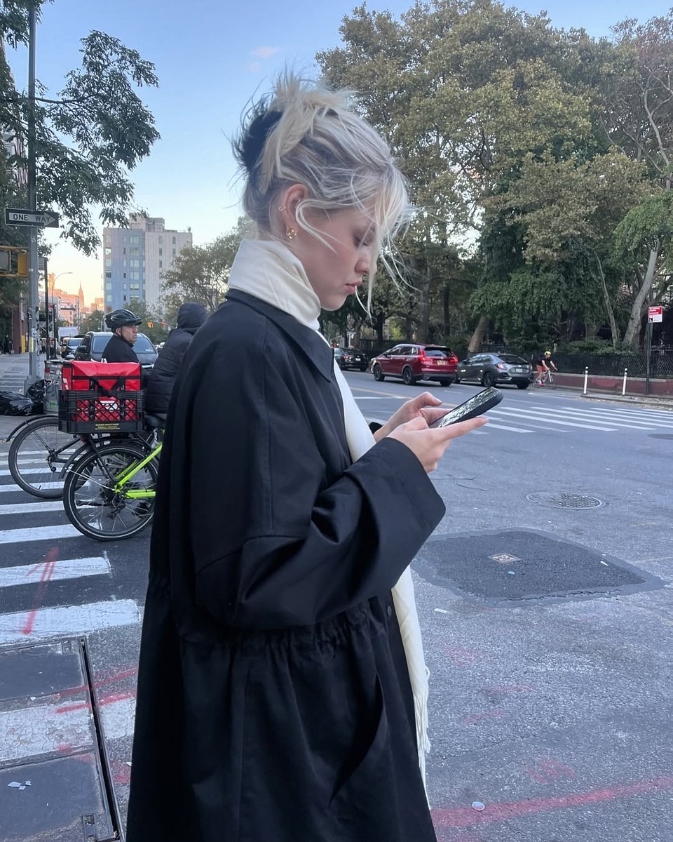 트렌치코트에 화이트 머플러 하나만 더해도 확실히 달라 보입니다. 이때 블랙 트렌치코트와 화이트 머플러의 대비가 룩을 또렷하게 만들어주고, 포근한 질감 덕분에 부드러운 무드까지 챙길 수 있죠. 과하지 않은 포인트로 가을 감성을 완성하는 가장 쉬운 방법이에요.