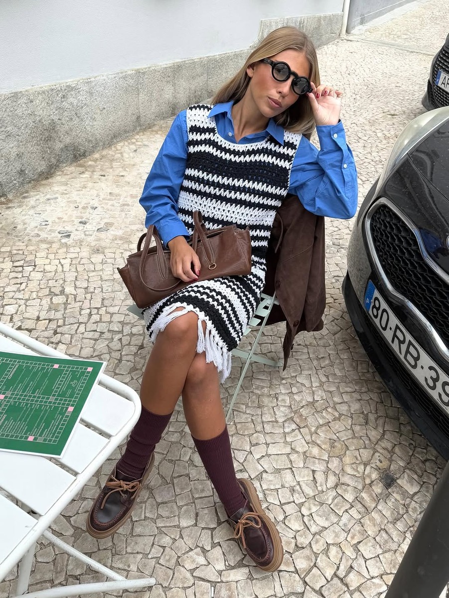 크로셰 원피스 위에 블루 셔츠를 걸치면 전혀 다른 무드가 연출됩니다. 원피스 특유의 로맨틱한 분위기에 블루 셔츠의 담백함이 더해져 균형 잡힌 레이어드 룩이 완성돼요. 여름내 즐겨 입었던 원피스를 가을까지 입고 싶을 때, 셔츠를 레이어드 해 쿨한 데일리룩을 만들어 보세요.
