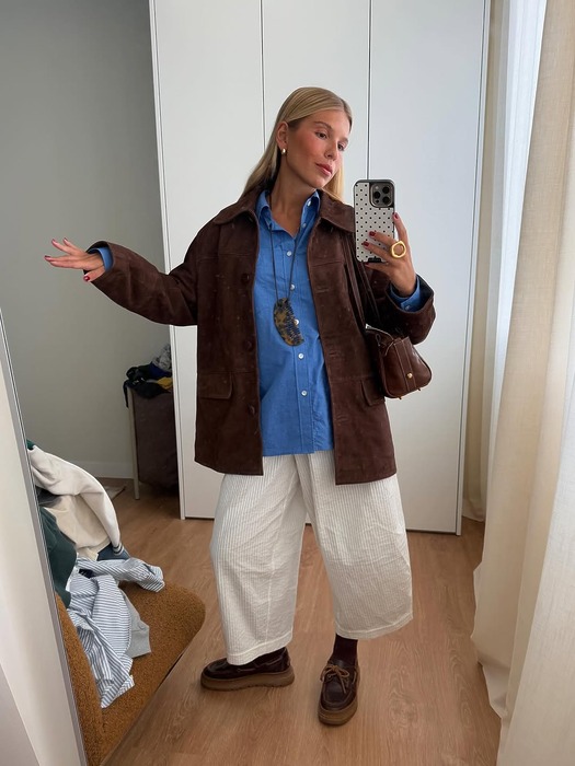 클래식한 블루 셔츠는 단독으로도 입어도 좋지만, 브라운 톤 아이템과 매치하면 가장 세련된 무드를 연출할 수 있습니다. 짙은 블루에는 다크 브라운 재킷, 밝은 블루에는 베이지 컬러 아우터가 잘 어울리죠. 두 컬러의 톤을 통일했을 때 스타일링이 훨씬 정돈돼 보이고 트렌디함이 살아납니다.
