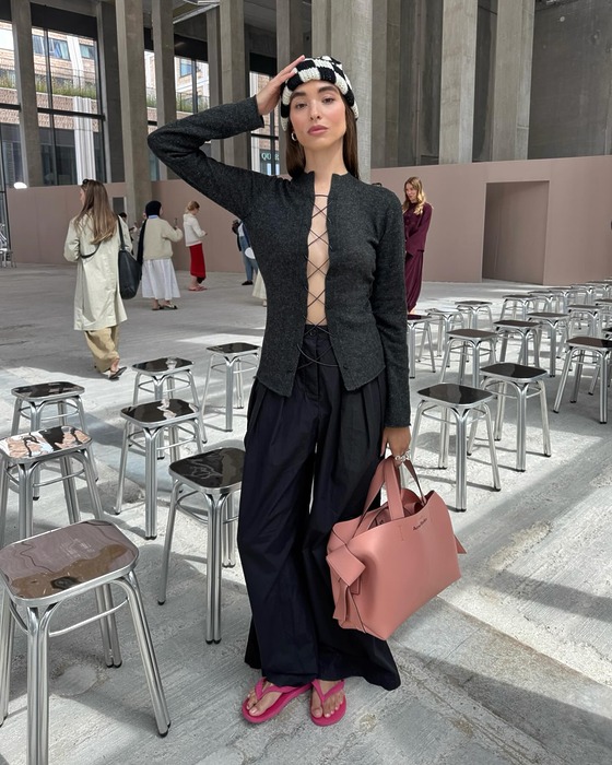 반면 최근에 진행된 프라다의 26 봄/여름 컬렉션에 참석한 모델 알라는 마치 두 개 이상의 모자를 쌓아 올린 듯한 독특한 느낌의 갈색 모자를 착용했습니다.