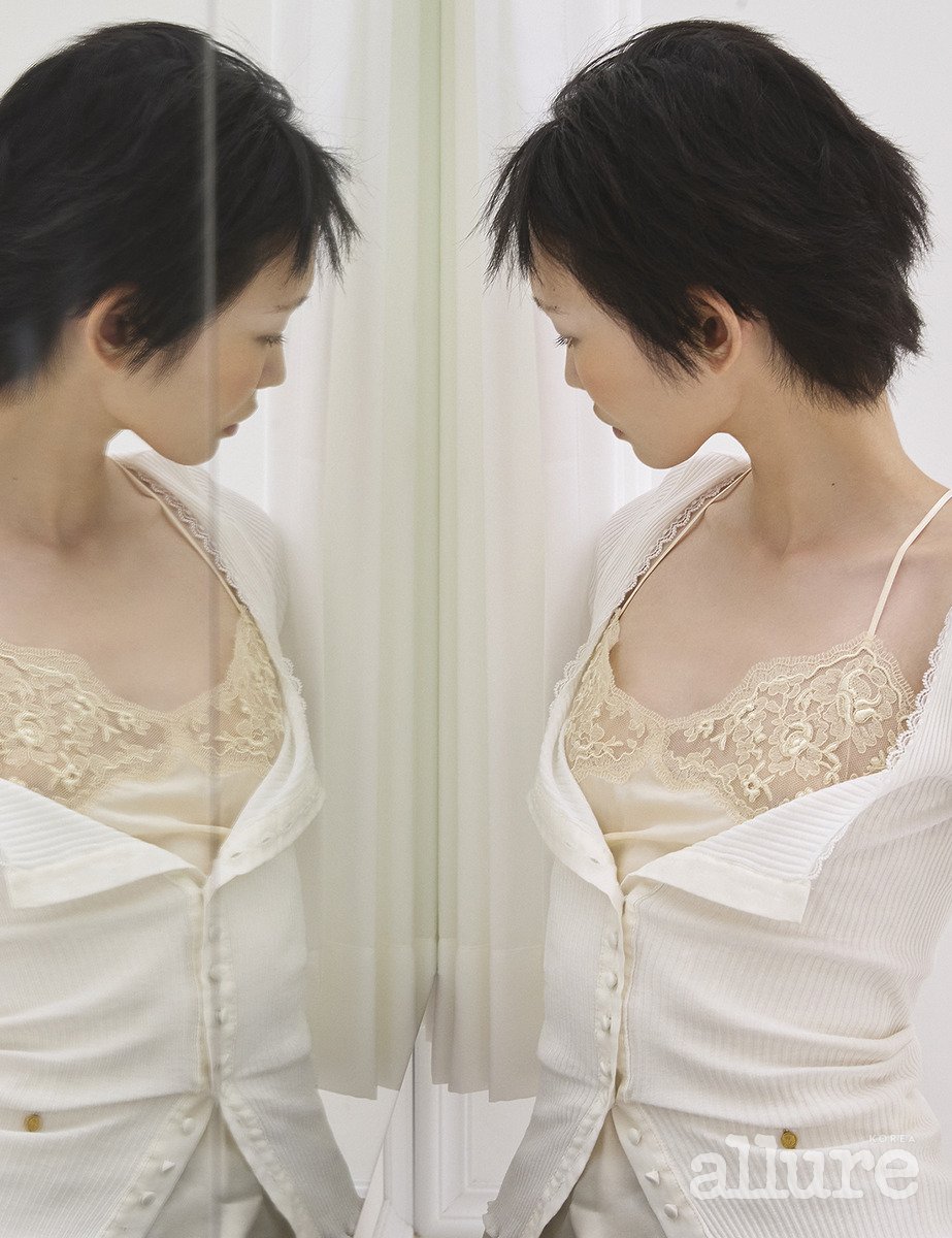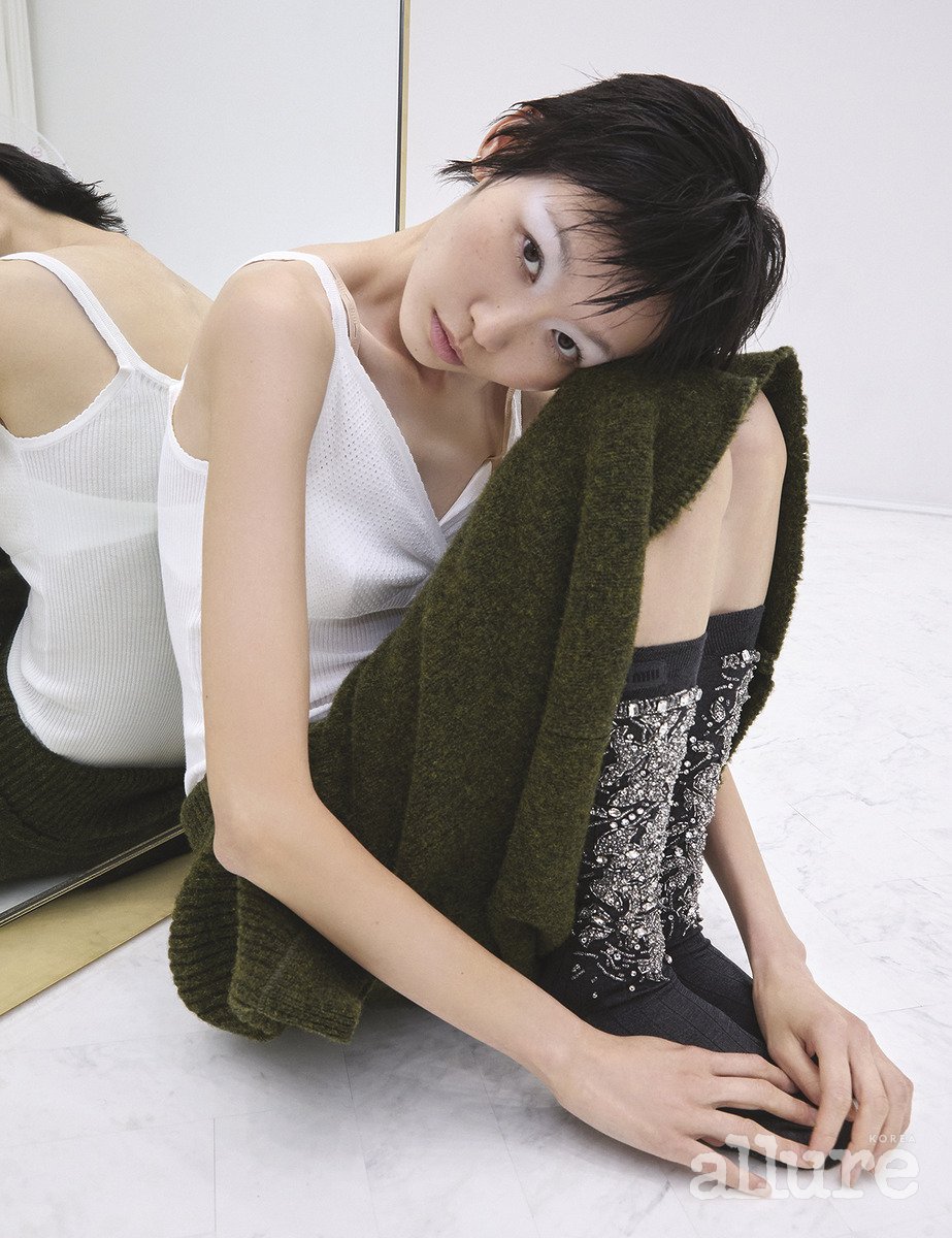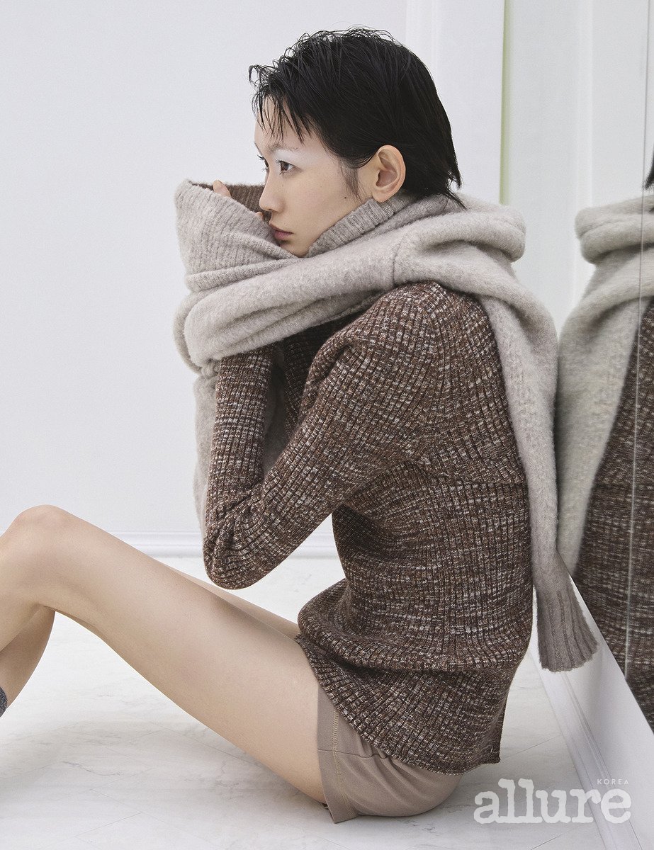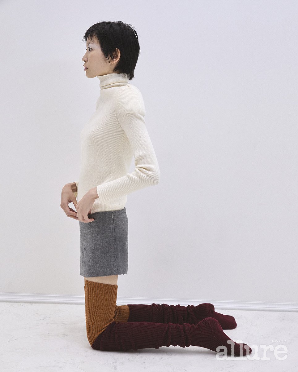 캐시미어 소재 크롭트 터틀넥 스웨터는 루이 비통(Louis Vuitton). 베이비 캐시미어 소재 카디건은 로로피아나(Loro Piana). 브리프는 꾸레쥬.