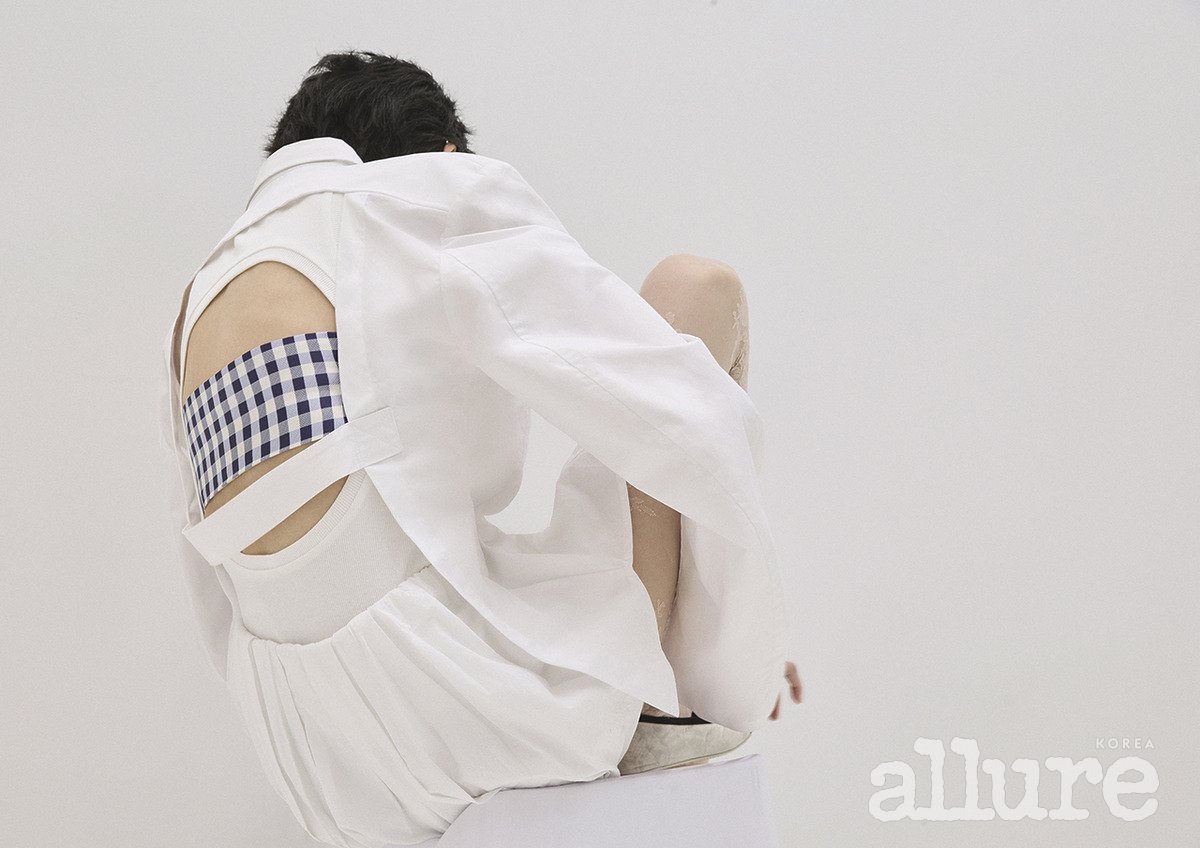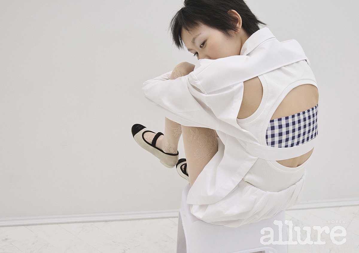 체크 패턴 브라톱은 셀프포트레이트(Self-Portrait). 백리스 셔츠는 푸시버튼(Push Button). 슬리브리스 톱과 셔링 미니스커트는 네헤라(Nehera). 플랫 슈즈는 샤넬(Chanel).
