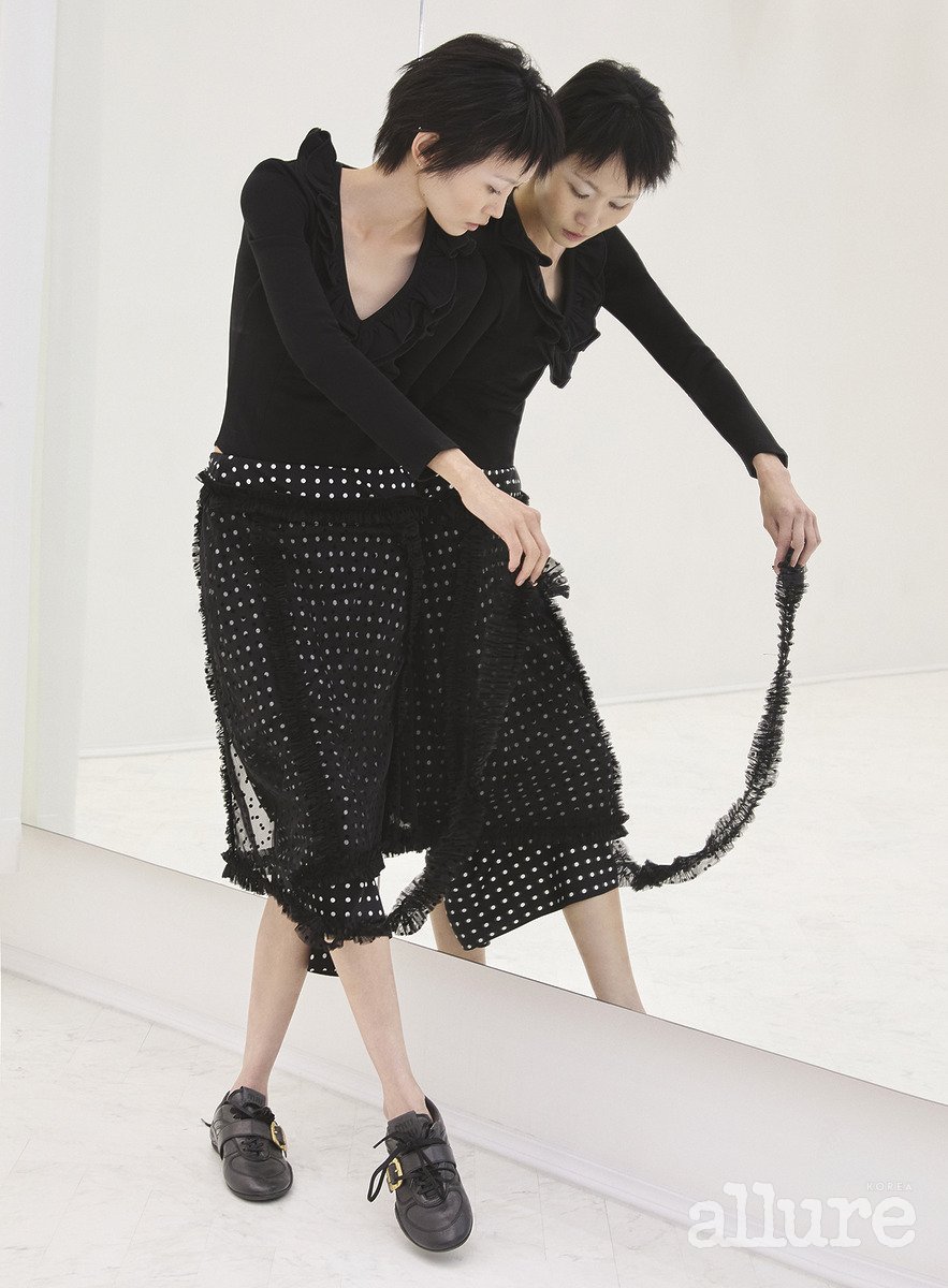 스커트 하나만으로 뭔가 허전할 때는 완성도를 높여줄 스커트 레이어링을 추천한다. 여러 겹을 덧입기 불편한 이들을 위해, 다양한 브랜드에서 레이어 스타일 스커트를 선보이니 걱정 말길. 러플 디테일 보디슈트는 오픈와이와이(Open Yy). 안에 입은 폴카 도트 패턴 새틴 스커트는 폴로 랄프 로렌(Polo Ralph Lauren). 레이어링한 도트 패턴 시스루 스커트는 로크(Rokh). 레더 스니커즈는 미우미우.