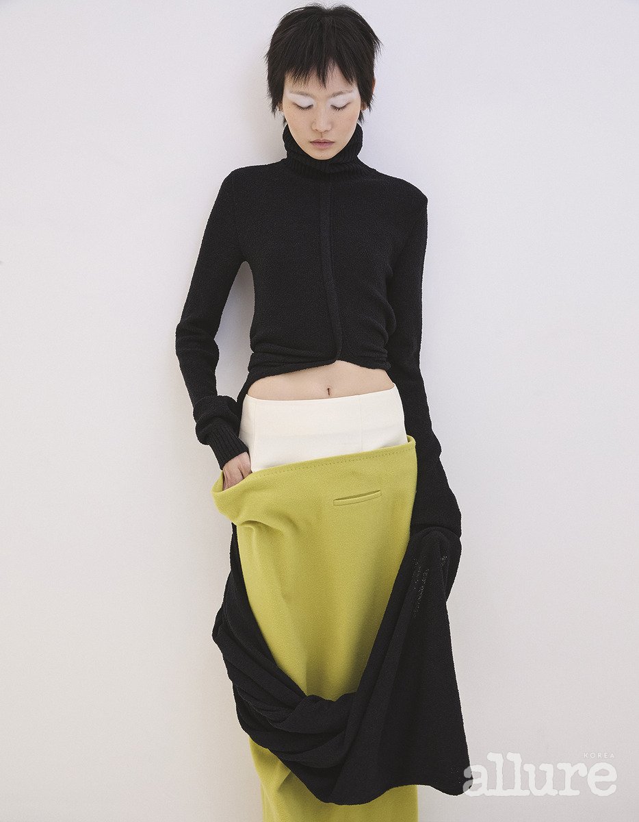 드레이퍼리 실루엣이 돋보이는 스웨터는 스포트막스(Sportmax). 더블 레이어 디자인의 스커트는 진선(Jinsun).