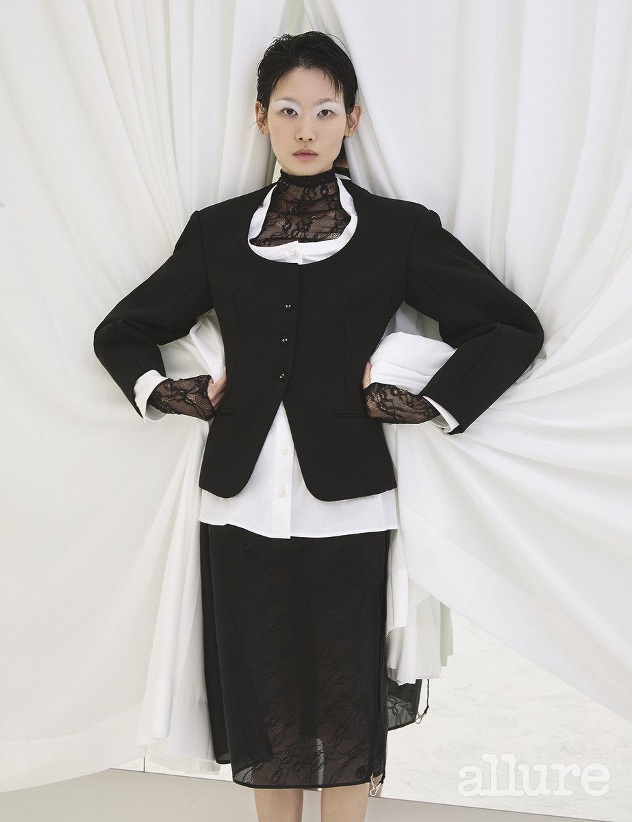 여러 아이템을 한 번에 즐기는 환절기 스타일링. 시어한 이너 톱 위로 셔츠와 재킷, 그리고 니트웨어까지 겹쳐보자. 기장을 고려해 선택한 아이템으로 절묘한 레이어를 보여주는 것이 포인트. 레이스 모크넥 티셔츠와 스커트는 꾸레쥬(Courreges). 아워글라스 실루엣 셔츠와 재킷은 자크뮈스(Jacquemus).