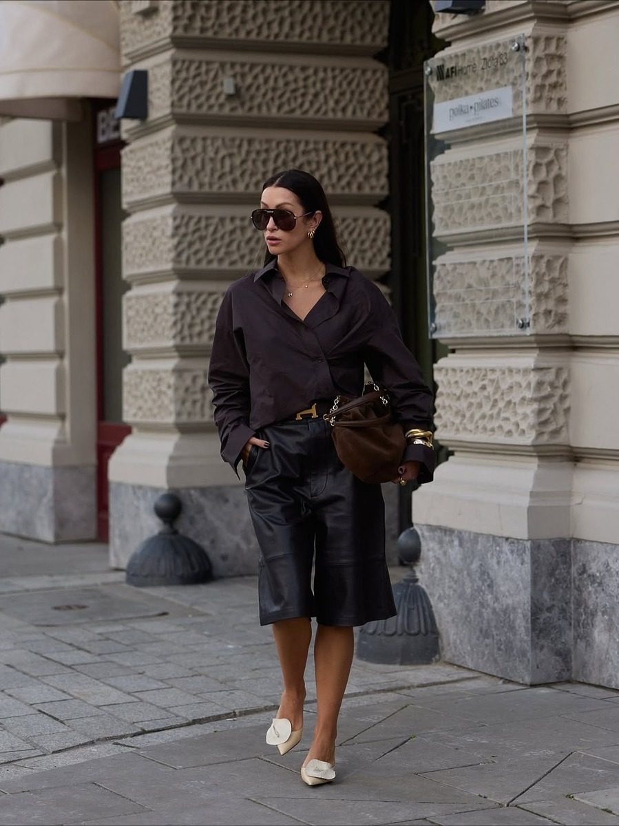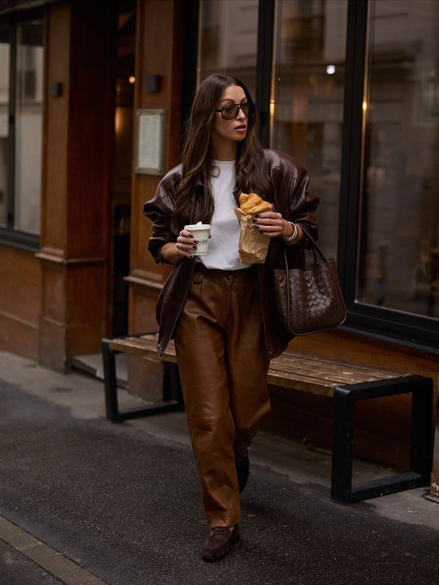가죽 팬츠나 스커트는 레더 스타일링 중 가장 실용적인 접근법이에요. 가을에 잘 어울리는 니트 소재와 매치 하면 실패할 수 없는 정석 같은 느낌이죠. 오버핏 니트나 셔츠와 레더 소재 하의를 매치하면 가을 감성이 물씬 느껴지는 감각적인 룩이 완성돼죠. 스커트는 길이에 따라 완전히 다른 분위기를 연출할 수 있어요. 꼭 블랙 컬러만 고집할 필요 없어요. 카멜, 브라운, 버건디, 올리브 그린처럼 가을에 꼭 어울리는 딥한 컬러는 흔하지 않은 매력 덕분에 색다른 느낌을 낼 수 있어요.