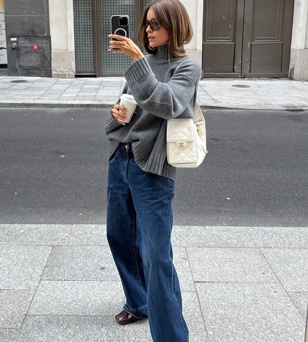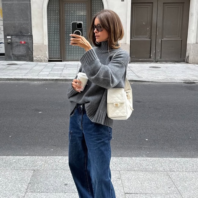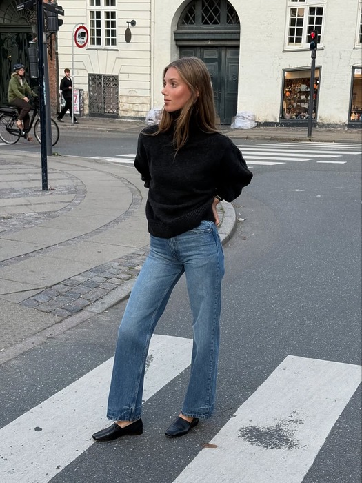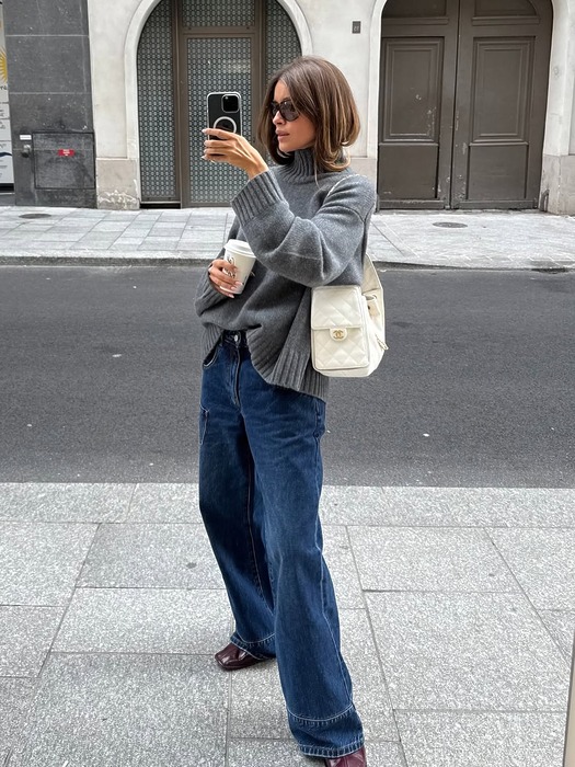 실패할 걱정 없는 무채색 터틀넥과 데님 팬츠 조합은 단순하지만 그만큼 힘이 있습니다. 이 스타일링에서 터틀넥 니트보다 중요한 것이 있으니, 바로 데님 팬츠! 박시한 실루엣의 니트와 균형이 맞도록 스트레이트나 와이드 진을 선택해야 촌스러워 보이지 않거든요. 단정함 속에서도 여유로운 무드를 연출할 수 있어, 부담 없는 출근룩으로 제격입니다.