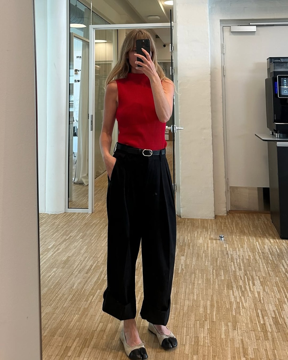 슬리브리스 터틀넥 니트는 오피스 룩에 신선한 무드를 더해 줍니다. 어깨와 목선을 드러내는 과감한 실루엣이 부담스럽다면, 블랙 카디건이나 블레이저로 노출을 줄여 보세요. 여기에, 블랙 슬랙스와 플랫슈즈로 깔끔하게 마무리하면 기본에 충실하면서도 개성 있는 출근룩 완성됩니다.