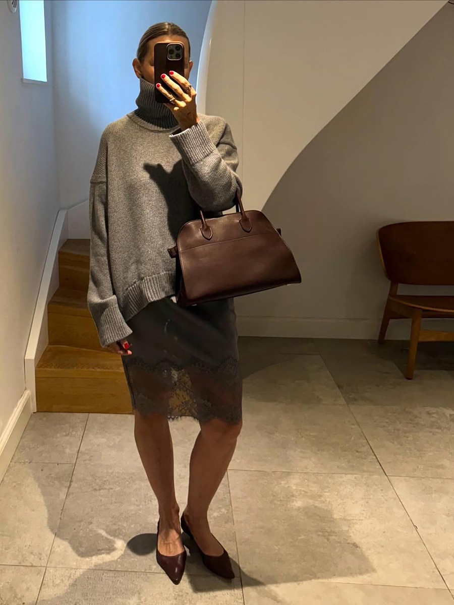 터틀넥 니트에 레이스 스커트와 스틸레토 힐을 매치하면 로맨틱한 변주가 가능해요. 자칫 허전해 보일 수 있는 레이스 스커트의 단점을 포근한 터틀넥 니트가 채워주고, 스텔레토 힐이 룩에 힘을 실어주니 포멀함과 로맨틱함이 동시에 느껴지는 스타일링이 연출됐죠.