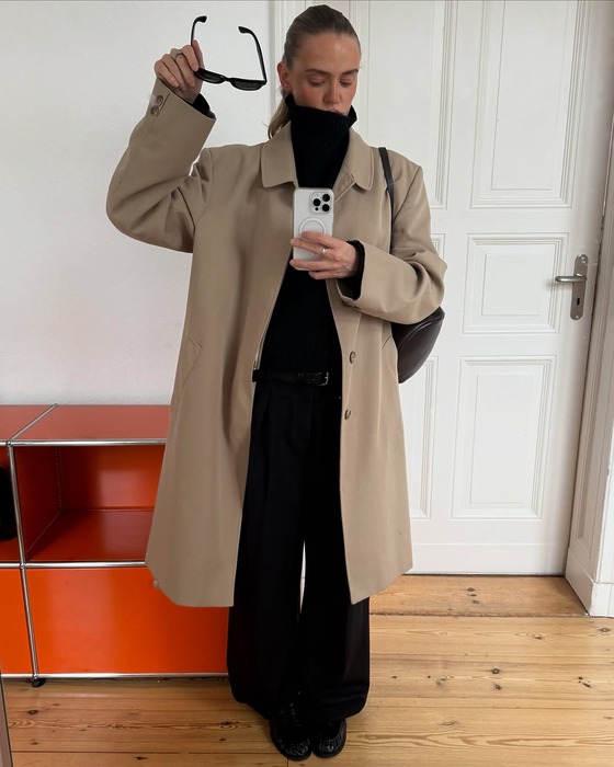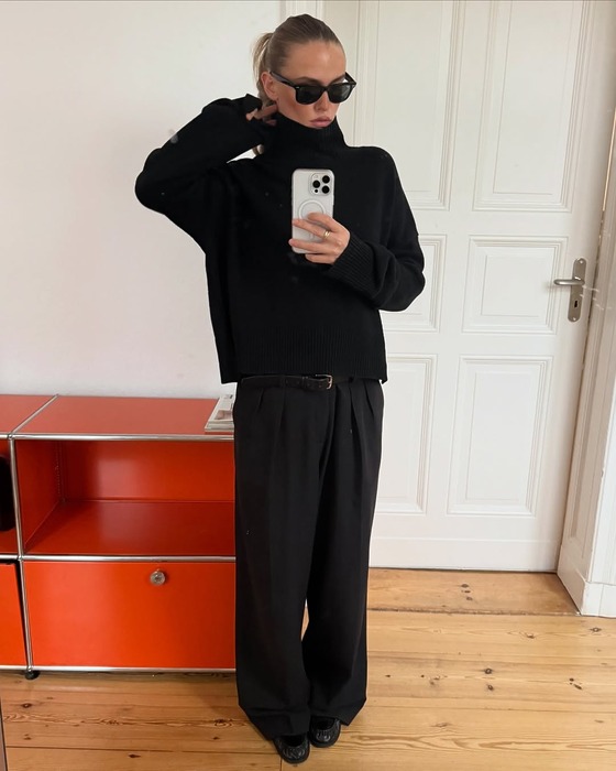 시크한 무드를 강조하고 싶다면 블랙 터틀넥에 블랙 슬랙스가 제격! 머리를 깔끔하게 넘겨 묶고 선글라스를 더하면 카리스마 넘치는 룩이, 트렌치 코트를 더하면 클래식한 룩이 연출됩니다. 매치하는 아이템에 따라 전혀 다른 무드를 자유자제로 넘나들 수 있다는 것이 터틀넥 니트의 가장 큰 매력이죠.