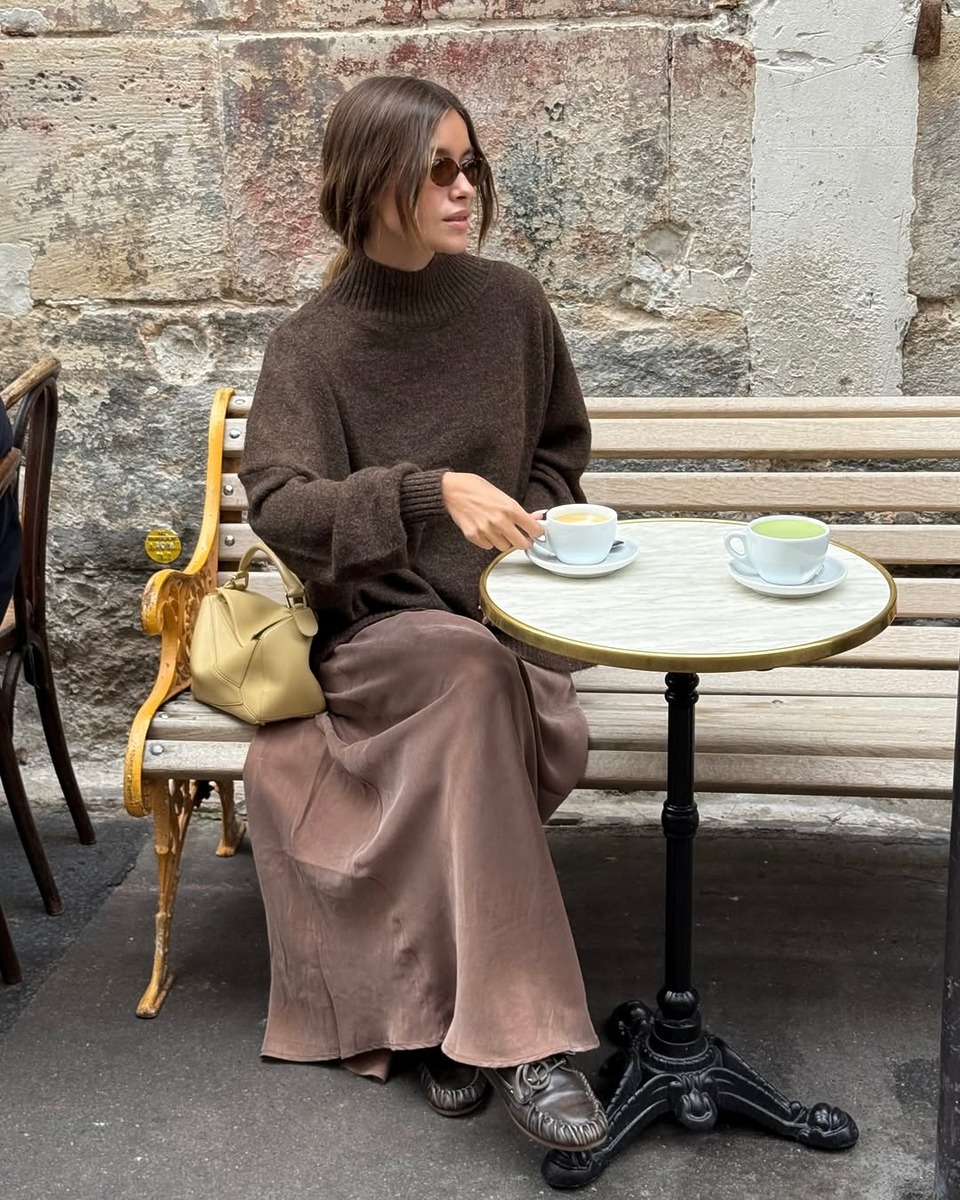 브라운 터틀넥과 롱스커트의 톤온톤 조합은 가을의 따뜻함을 그대로 담아냅니다. 상하의의 톤을 맞춘 덕분에 차분하면서도 고급스러운 무드가 살아나요. 여기에, 액세서리나 슈즈로 은은한 포인트를 더하면 밋밋함 없이 완벽한 룩이 완성됩니다.