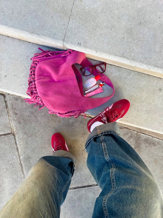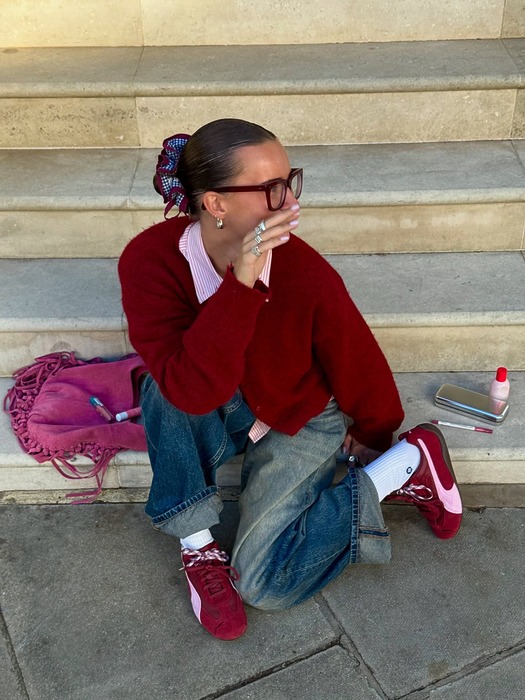 조금 더 과감하게 레드를 즐기는 방법은 바로 의상에 레드를 물들이는 겁니다. 롱 코트 속에 레드 트라우저를 받쳐 입거나 레드 셔츠를 슬쩍 내비치는 식으로요. 베이식한 아이템에 딥한 레드 팬츠가 더해지니 스타일리시함이 살아나기 때문이죠. 혹은 다른 컬러와의 조합을 고려해 믹스매치하는 것도 재미있어요. 이를 테면 에밀리(@stylingemilybeaney)처럼 레드 푸마에 핑크 스웨이드 백을 매치하는 것처럼요. 레드 스웨터와 데님은 설명할 필요조차 없는 확신의 가을/겨울 룩입니다.