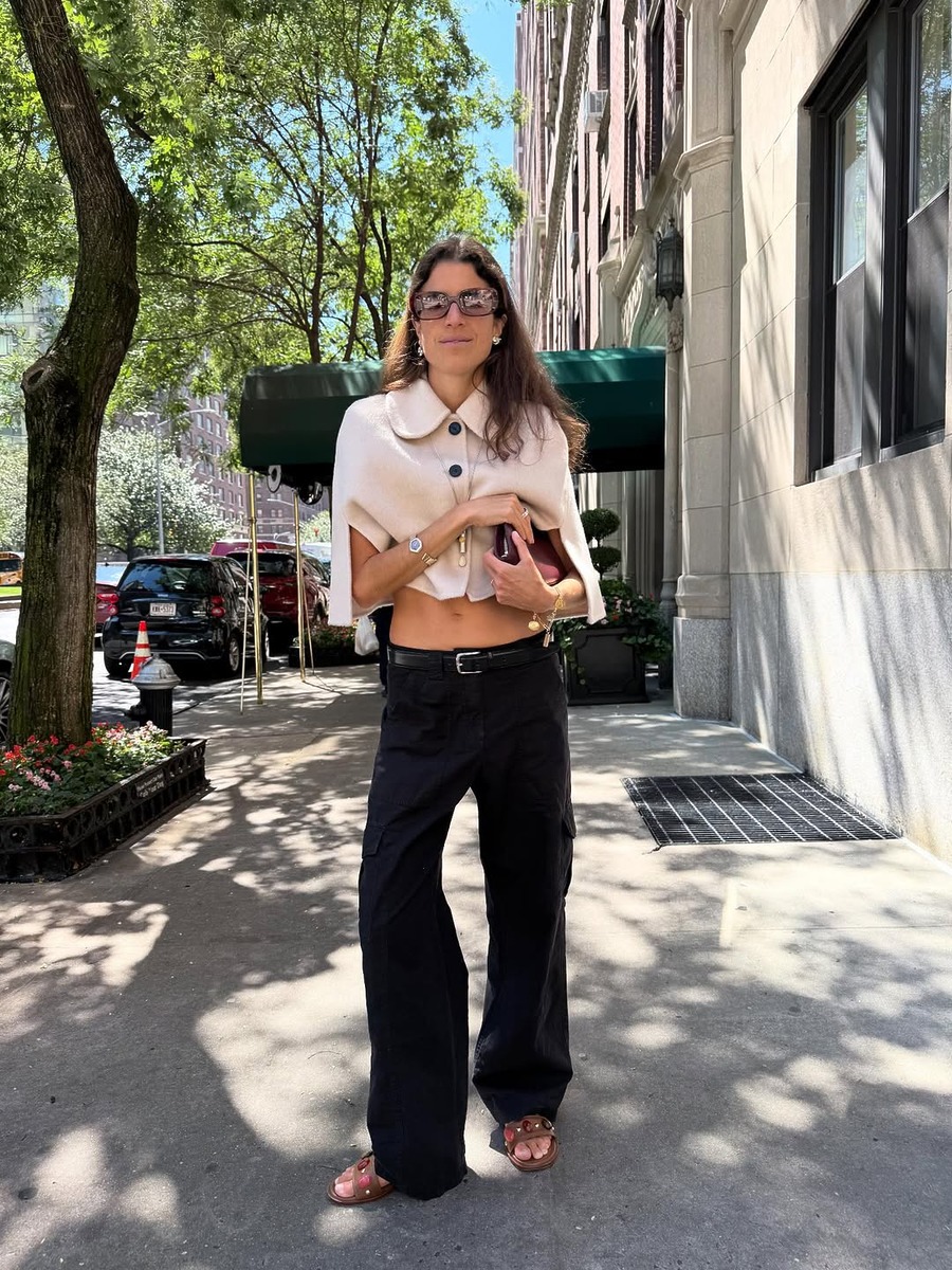 크롭 기장의 케이프는 통통 튀는 발랄함을 강조하고 싶을 때 제격입니다. 캐주얼한 블랙 카고 팬츠와 매치하면 지루해 보이지 않죠. 여기에 어두운 컬러의 클러치로 중심을 잡아 주고, 로퍼나 뮬같이 포멀하면서도 편안한 신발을 더해 마무리하면 포멀과 캐주얼함 사이 균형 잡힌 룩이 완성됩니다.