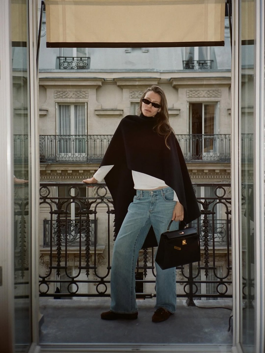 케이프의 가장 큰 장점은 어떤 룩에도 우아함을 더해 준다는 것. 연청 데님과 화이트 티셔츠, 가장 기본적인 캐주얼 조합도 블랙 케이프를 걸치면 분위기가 달라집니다. 심플한 착장 위에 케이프가 주는 볼륨감이 더해져 클래식한 무드로 변주되죠. 작은 백이나 로퍼 같은 아이템으로 마무리하면 과하지 않게 세련된 룩을 완성할 수 있어요.
