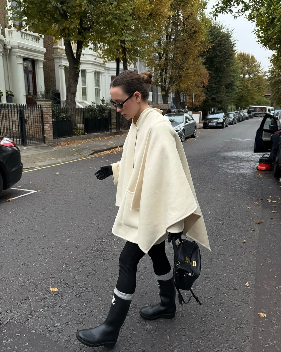 아이보리 케이프에 블랙 레인부츠를 매치하면, 빗속에서도 세련된 무드를 연출할 수 있습니다. 우아함과 실용성을 모두 갖춘 룩으로 비 오는 날 출근길부터 여행지까지 두루 활용할 수 있다는 것이 이 룩의 강점. 실루엣 자체로 존재감이 충분하기 때문에, 컬러는 단순하게 유지하는 것이 핵심입니다.