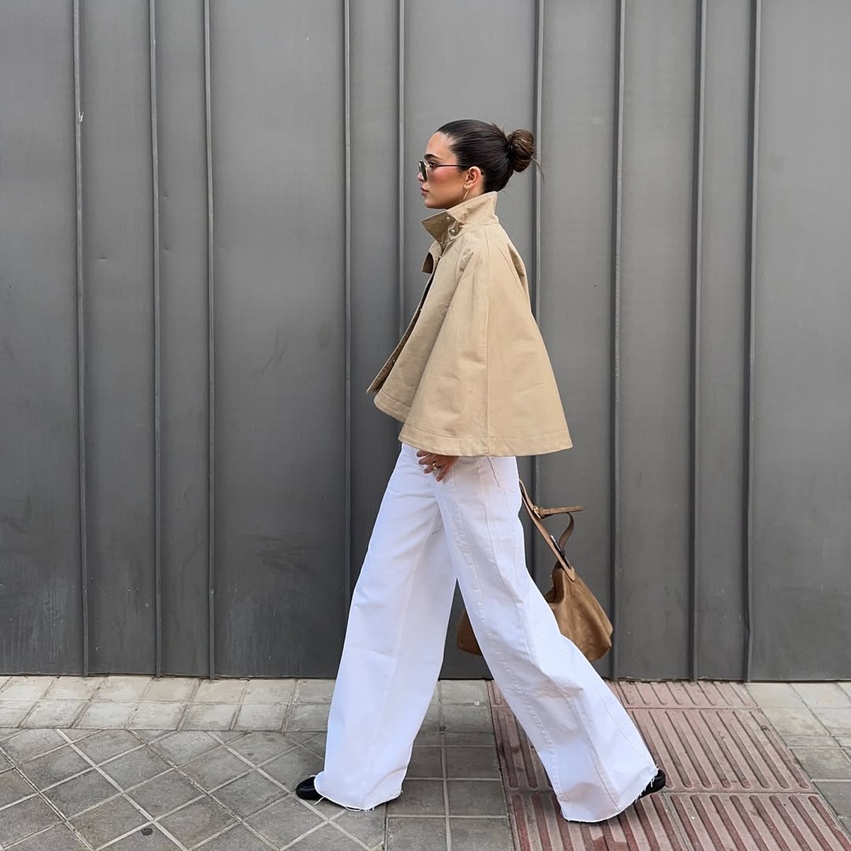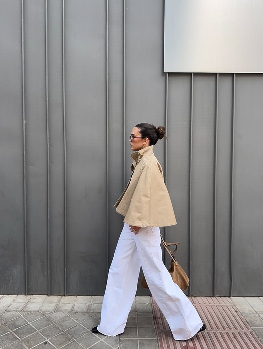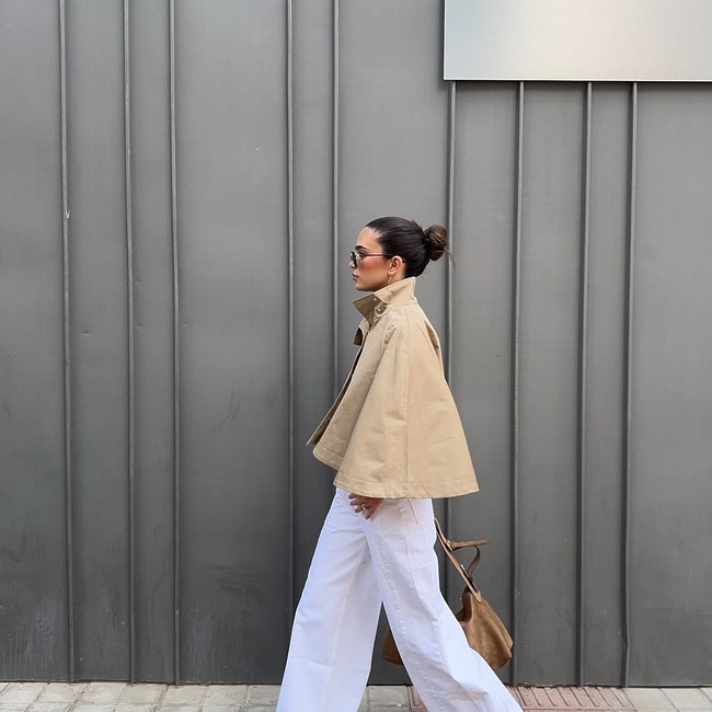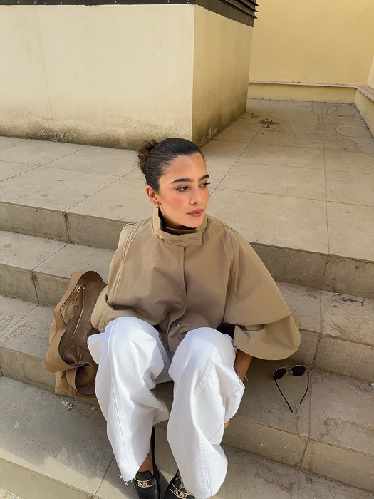 망토 형태의 트렌치 재킷을 보면 알 수 있듯 이번 시즌 트렌치 코트는 그 어느때보다 다양하게 변주되고 있습니다. 트렌치 코트의 클래식함과 케이프의 깔끔한 라인이 만나 미니멀한 무드를 뿜어내는데요. 깨끗한 화이트 진과 매치한 덕분에 불필요한 디테일은 덜어내고 깔끔하게 연출할 수 있죠.