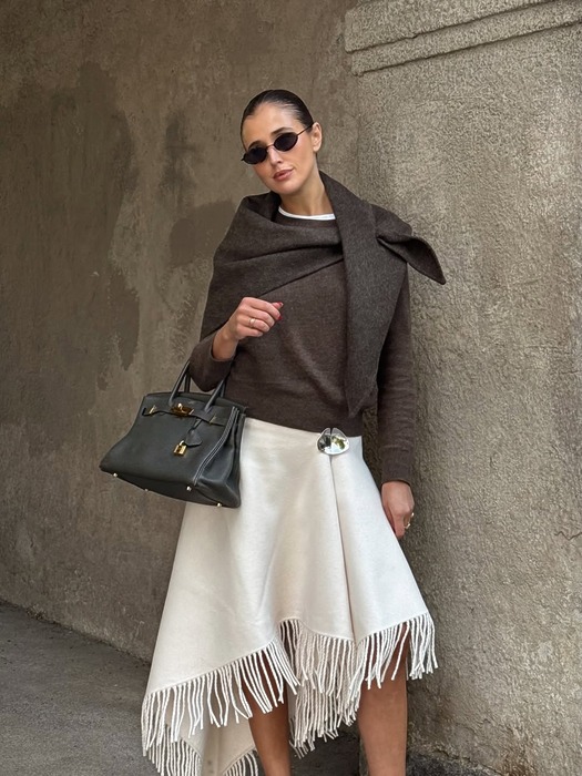 아우터 위에 다른 소재의 케이프를 걸치는 것도 좋은 방법. 각기 다른 소재의 충돌에서 나오는 색다르면서도 세련된 무드 덕분에 과하지 않으면서도 세련된 느낌을 주고요. 브라운 컬러 백이나 액세서리를 한두 개 더해주면 계절감까지 챙길 수 있습니다.