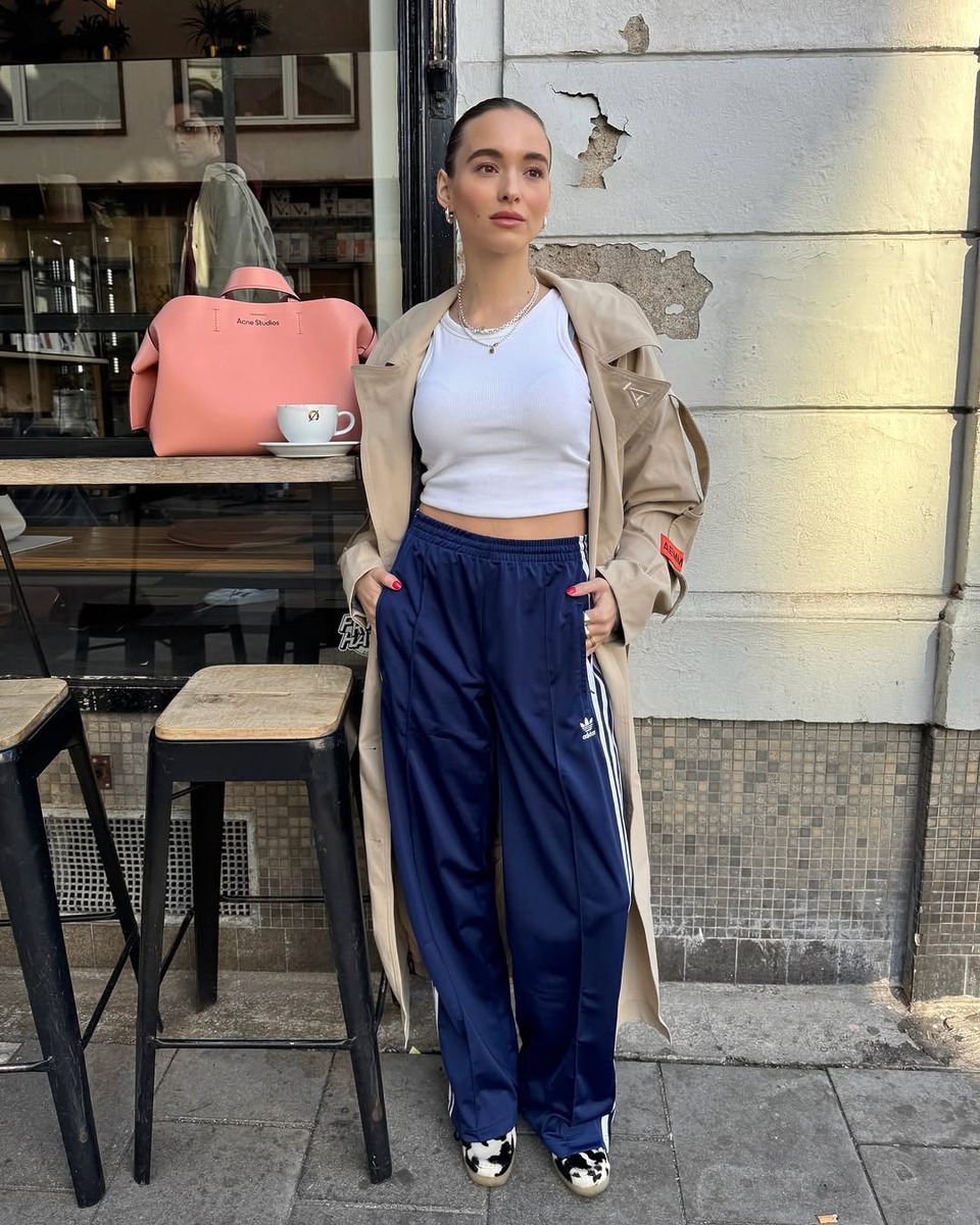 스포티한 트랙 팬츠 위에 위에 트렌치코트를 걸치면 가을에 딱 맞는 ‘꾸안꾸’룩이 완성됩니다. 여기에 패턴 스니커즈를 더해 경쾌한 포인트를 주면 스타일링에 위트가 더해지죠. 츄리닝의 편안함과 트렌치코트의 클래식함이 어우러지며, 예상치 못한 신선한 스타일링이 연출됩니다.
