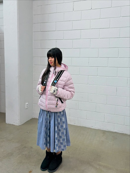 경량패딩의 가장 큰 장점 중 하나인 가벼움을 컬러로 표현해 볼 수도 있어요. 만약 칙칙하고 어두운 겨울 아우터에 손이 자주 가지 않는다면 밝은 컬러를 선택하는 거죠. 솜사탕처럼 몽실몽실한 핑크 경량패딩은 올가을부터 꾸준히 트렌드 반열에 오른 체크 스커트와 코디해 보세요. 파스텔 컬러의 사랑스러움이 그대로 묻어나오죠.