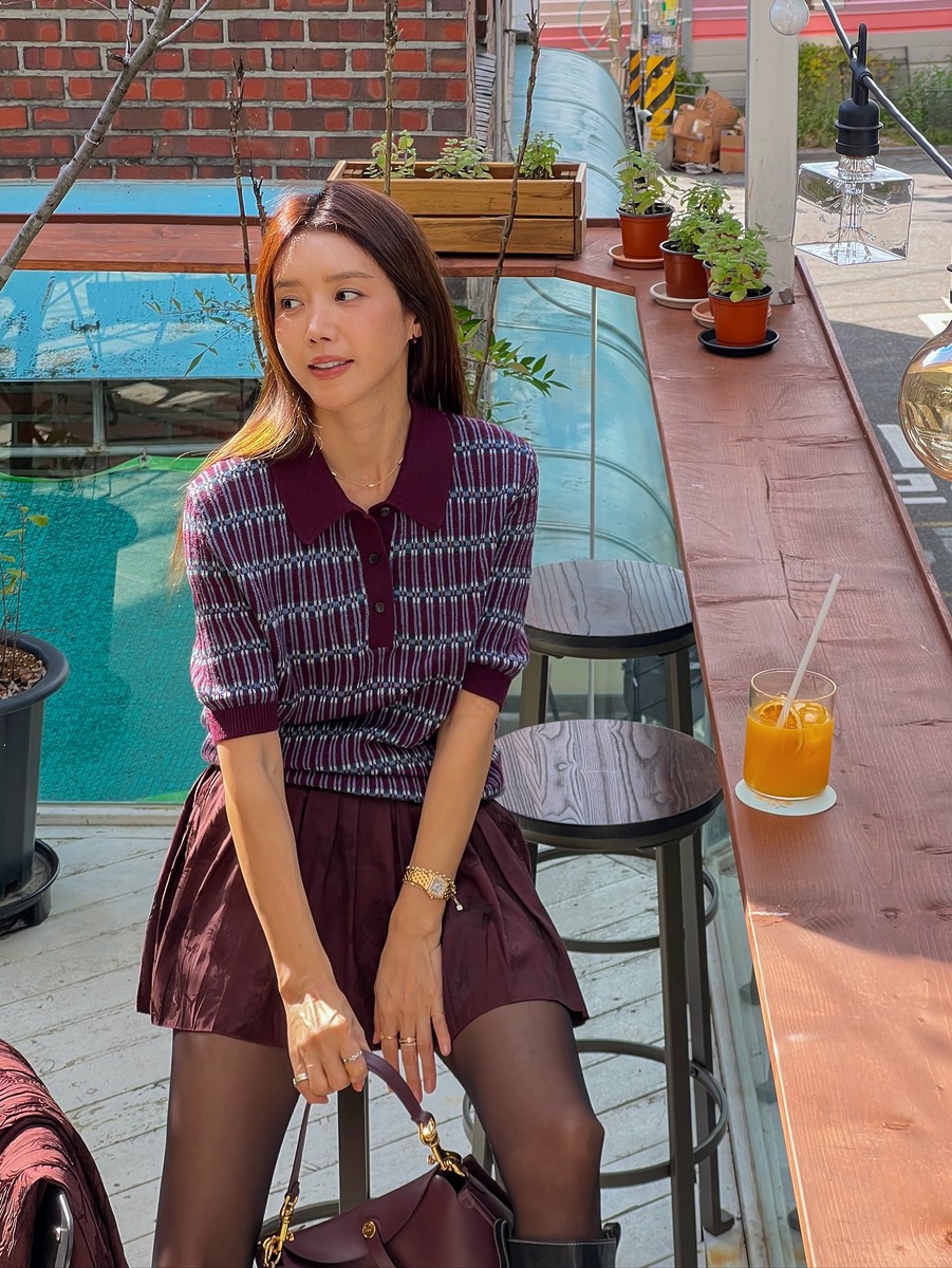재킷 단추를 좀 풀어볼까요? 수트 장인 채정안은 버건디 컬러 셋업을 선택했습니다. 가을 느낌 물씬 자카드 소재 더블 브레스티드 재킷에 플리츠 스커트, 이너로는 같은 컬러의 폴로 니트를 입었는데요. 재킷을 벗으면 프레피, 입으면 보호시크로 분위기가 달라집니다. 앞코에 메탈 장식이 들어간 블랙 롱부츠가 킥이네요.
