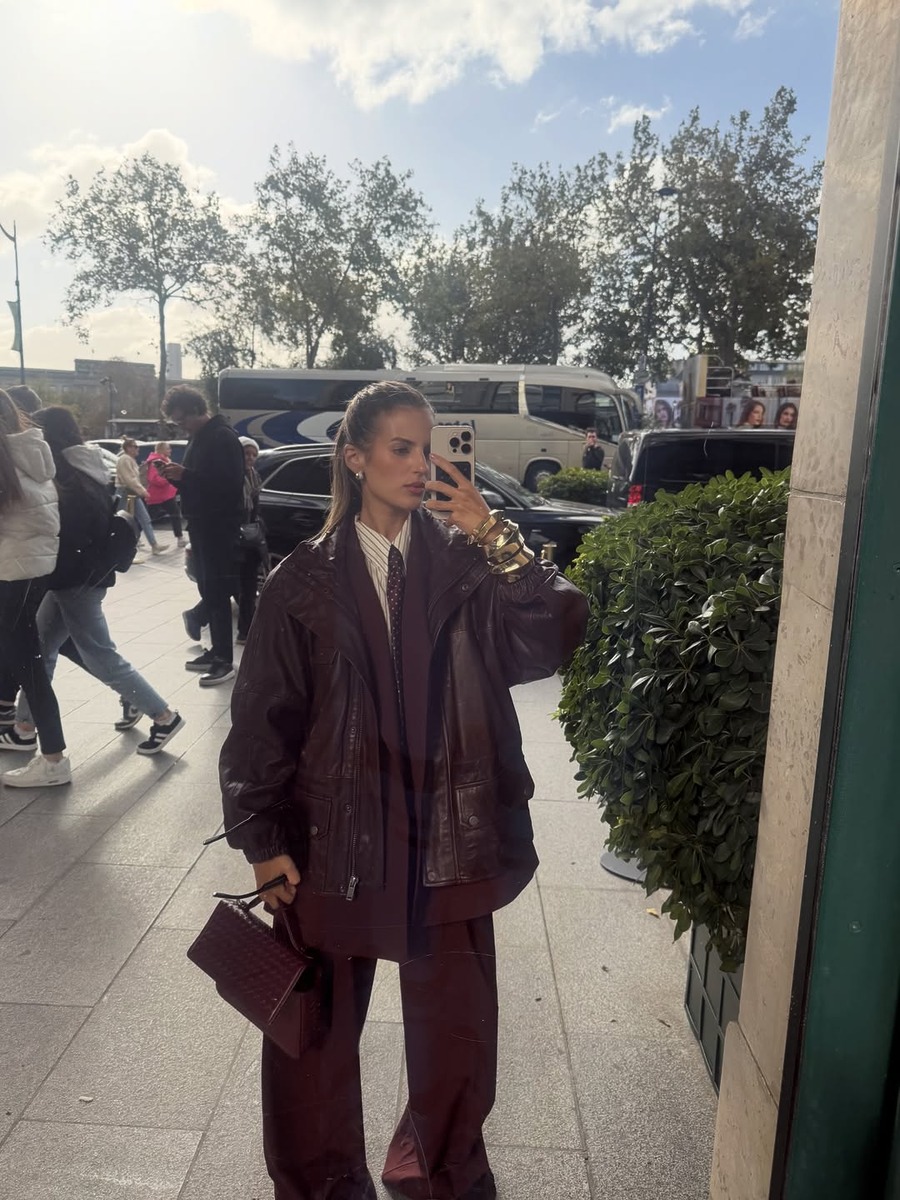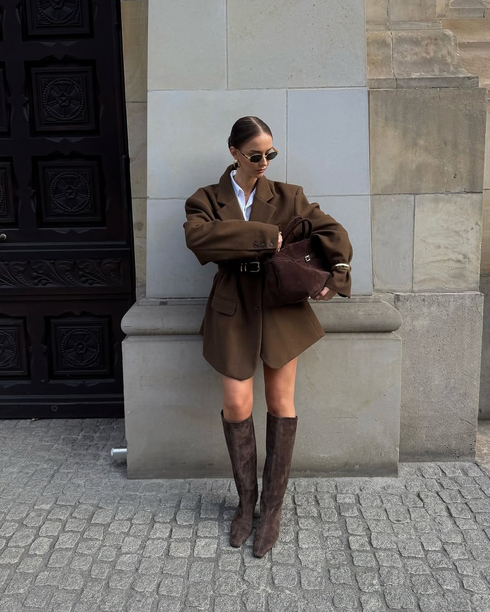 데일리룩으로 즐겨 입을 가죽 재킷이나 블레이저도 몸에 핏 되는 디자인보다는 마치 남자친구의 재킷을 빌려 입은 듯 큰 디자인이 멋스러워요. 오버사이즈 재킷 스타일링에는 두 가지 방법이 있어요. 첫 번째, 하의의 실루엣을 슬림하게 가져가는 것. 다리가 드러나는 미니 스커트나 쇼츠를 입거나 혹은 적당히 핏되는 팬츠를 입는 거에요. 다리가 드러나면 전체적으로 경쾌한 이미지로 스타일이 완성돼요. 두 번째 방법은, 상의와 하의를 모두 루스하게 매치하는 거죠. 와이드 팬츠나 롱 스커트와 같은 아이템으로요. 이렇게 믹스&매치할 때는 주얼리나 액세서리를 과도하게 사용하지 않고 미니멀한 가죽 백, 심플한 부츠, 얇은 골드 주얼리 정도로만 포인트를 줘 전체적인 밸런스를 맞추는 것이 포인트에요.