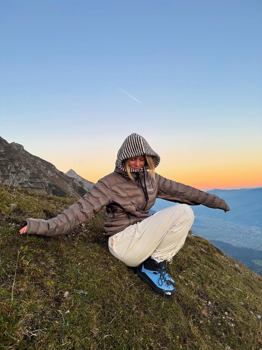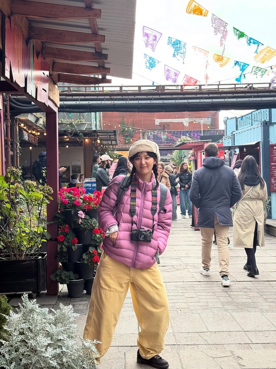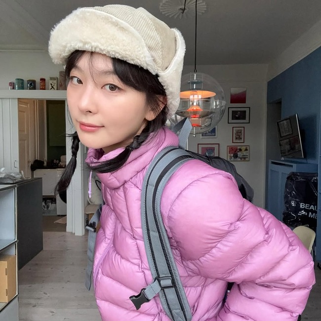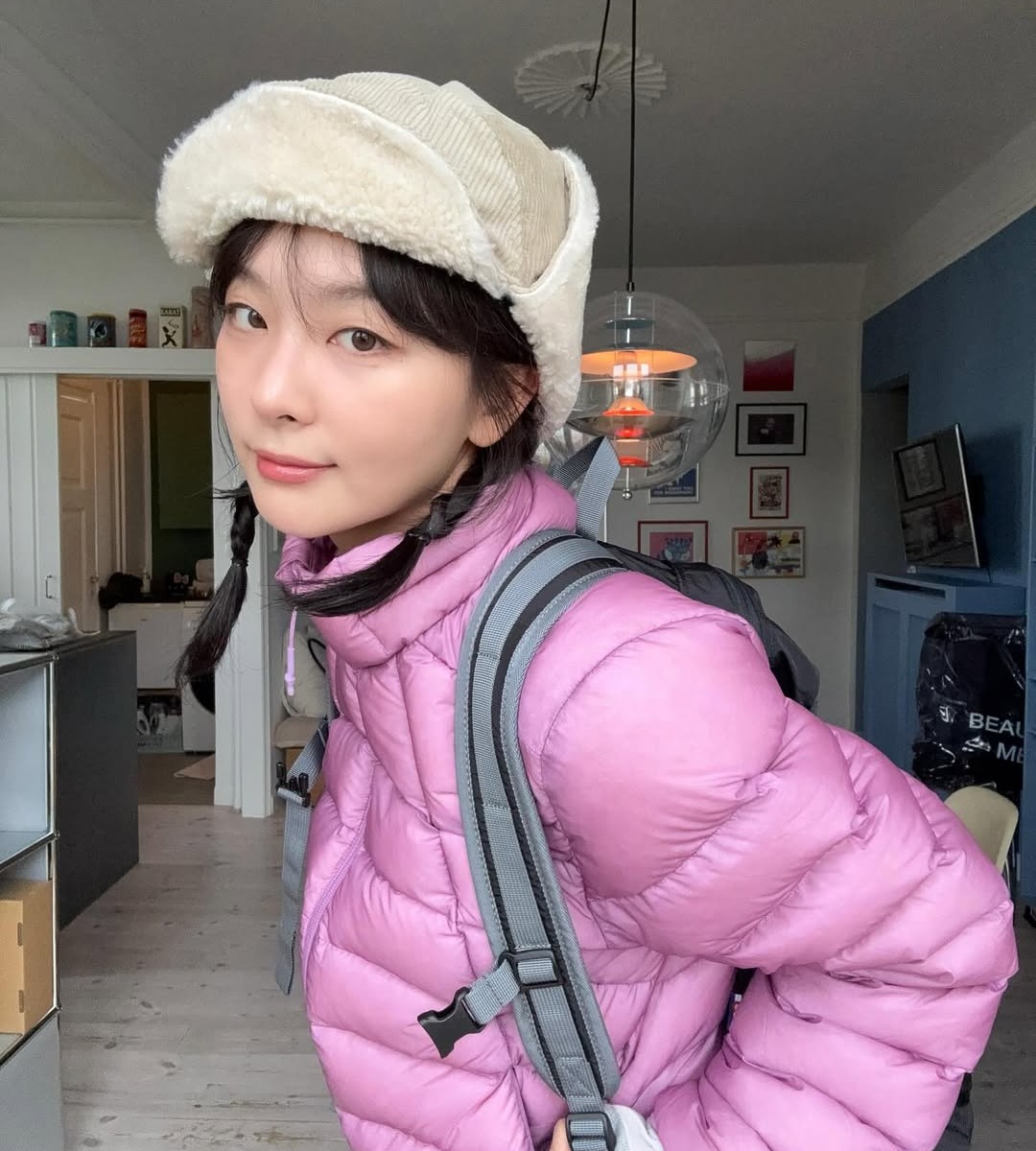 가벼움과 실용성이 무엇보다 중요한 여행지에서 경량 패딩은 선택이 아닌 필수! 유럽 여행을 떠난 슬기는 진한 핑크 경량 패딩에 버터옐로 워크 팬츠를 매치하면 보기만 해도 기분이 좋아지는 따뜻한 스타일링을 선보였어요. 시어링 햇과 양갈래 브레이드 헤어로 귀여운 디테일까지 챙기면 인생샷도 문제없는 여행 룩이 되죠.