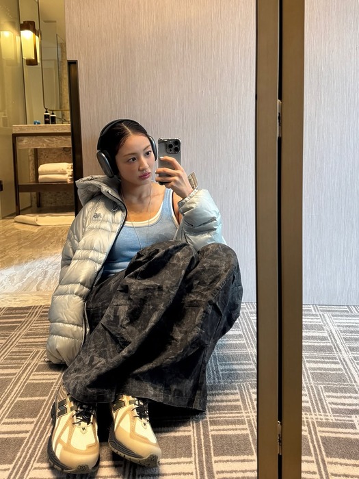 지효는 하늘색 탱크톱에 실버 경량 패딩을 더하고 카모플라주 팬츠로 스트릿 무드를 완성했어요. 무채색 아이템 중심이지만, 하늘색 이너와 패턴 팬츠를 더해 밋밋해 보이지 않죠. 여기에 키링을 더한 미니백으로 깜찍한 포인트를 주면 쿨한 도시 여행자 룩이 완성됩니다.