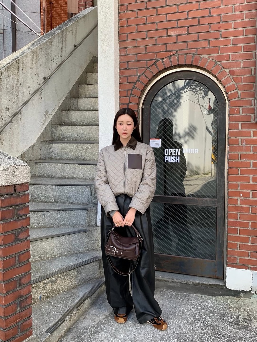 경량 패딩이 오피스 룩에도 어울릴까 싶다면, 퀼팅 패턴이 들어간 디자인을 주목하세요. 밝은 브라운 컬러의 퀼팅 패딩에 슬랙스를 매치하면 포멀한 느낌이 살아납니다. 여기에 딥 브라운 슈즈와 백으로 마무리하면, 따뜻하면서도 정돈된 인상을 줄 수 있어요.