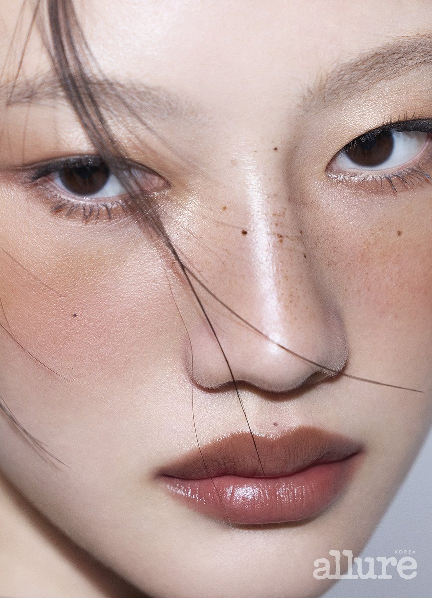 CHEEKS & EYES 아몬드 베이지 블러셔를 광대부터 콧등까지 연결해 넓게 바르고, 같은 제품으로 눈두덩과 애굣살까지 쓸어준다. 눈 밑과 콧등에는 톤 다운된 모브 블러셔를 브러시로 두드리듯 얹는다. 브라운 섀도와 메이크업 픽서를 섞고 제형을 칫솔에 묻힌 뒤, 콧등 위에서 솔을 손가락으로 털며 주근깨를 뿌려준다.