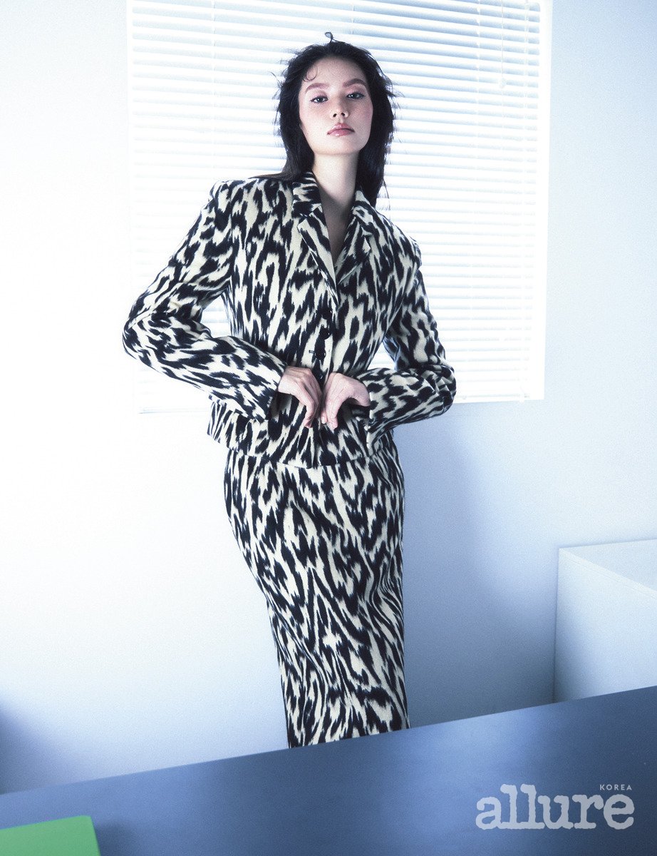 강렬한 레오퍼드 프린트의 쇼트 재킷과 펜슬스커트는 렉토(Recto).