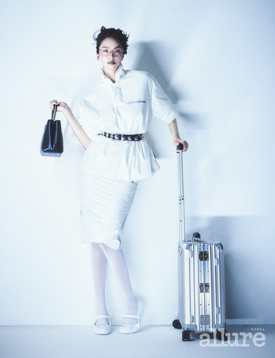 가벼운 태피터 소재의 패디드 톱과 펜슬스커트는 라코스테(Lacoste). 스터드 장식 가죽 벨트는 케이트(Khaite). 나파 가죽 소재의 발레리나 플랫 슈즈는 로저 비비에(Roger Vivier). 블루라이트 차단 기능이 있는 안경은 샤넬(Chanel). 이어 커프는 톰우드(Tom Wood). 메탈 장식 핸들을 매치한 토트백은 까르띠에(Cartier). 알루미늄 슈트케이스는 리모와(Rimowa).