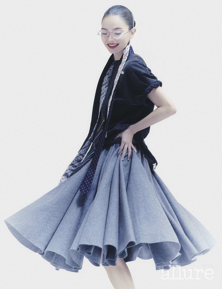 반소매 티셔츠는 아크네 스튜디오×카파(Acne Studios×Kappa). 울 플란넬 소재의 플레어스커트는 아미(Ami). 실크 소재의 체크 패턴 타이와 샹달 패턴 타이는 에르메스. 하트 스트라이프 패턴 타이는 비비안 웨스트우드(Vivienne Westwood). 무테 안경은 까르띠에.