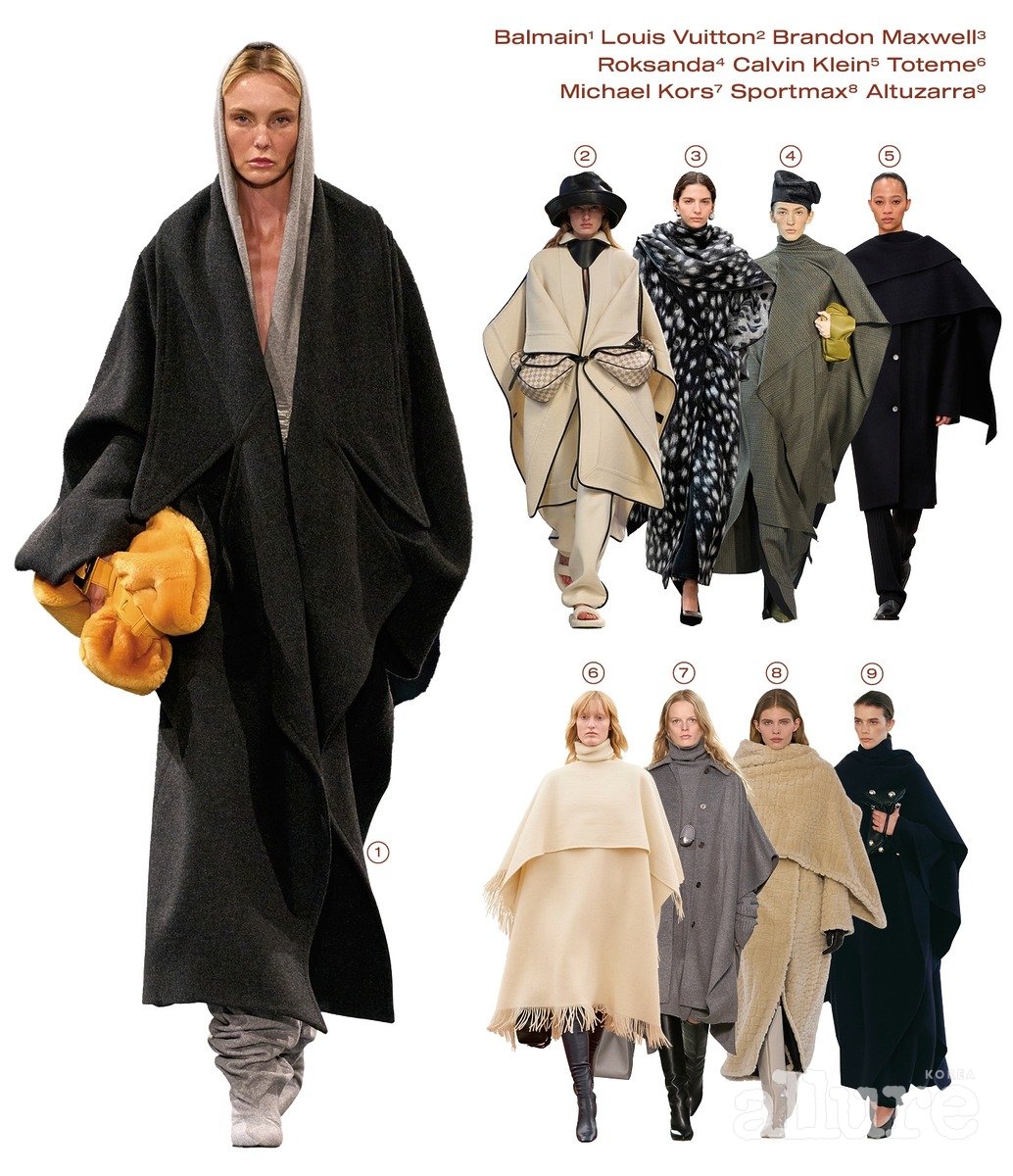 한편 드레이프의 부드러움 속에서도 구조적 긴장감을 잃지 않는 컬렉션도 눈에 띈다. 발맹은 과감히 세운 어깨선과 단단히 조인 벨트로 케이프형 드레이프를 전투복처럼 재해석했고, 캘빈클라인은 비대칭 패턴과 절제된 실루엣으로 모던함을 구현했다. 또 록산다는 겹겹이 쌓은 천의 레이어링으로 예술적 감성을 극대화하며, 드레이프의 움직임과 형태감에 주목했다. 드레이프 스타일 코트는 코트 하나로 완성하는 룩이라는 점에서 실용적이면서도 극적이다.