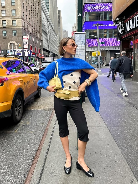 무채색 스타일링에 비비드한 니트를 걸치고 한쪽 팔만 빼입는 방식도 유행 중입니다. 이렇게 하면 니트의 면적이 줄어들어 강한 컬러에 대한 부담은 줄고, 실루엣에 재미는 더해지죠. 이너로는 도트나 스트라이프 패턴이 들어간 톱을 선택하면 예상치 못한 반전 매력까지 더할 수 있습니다.