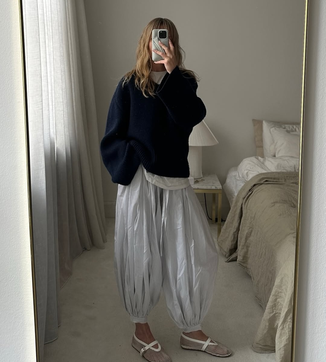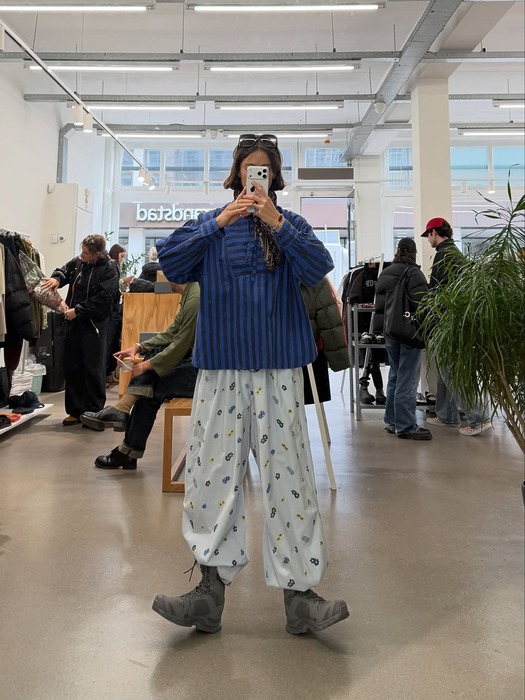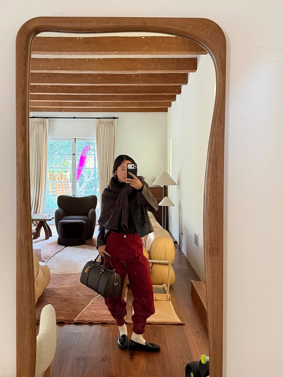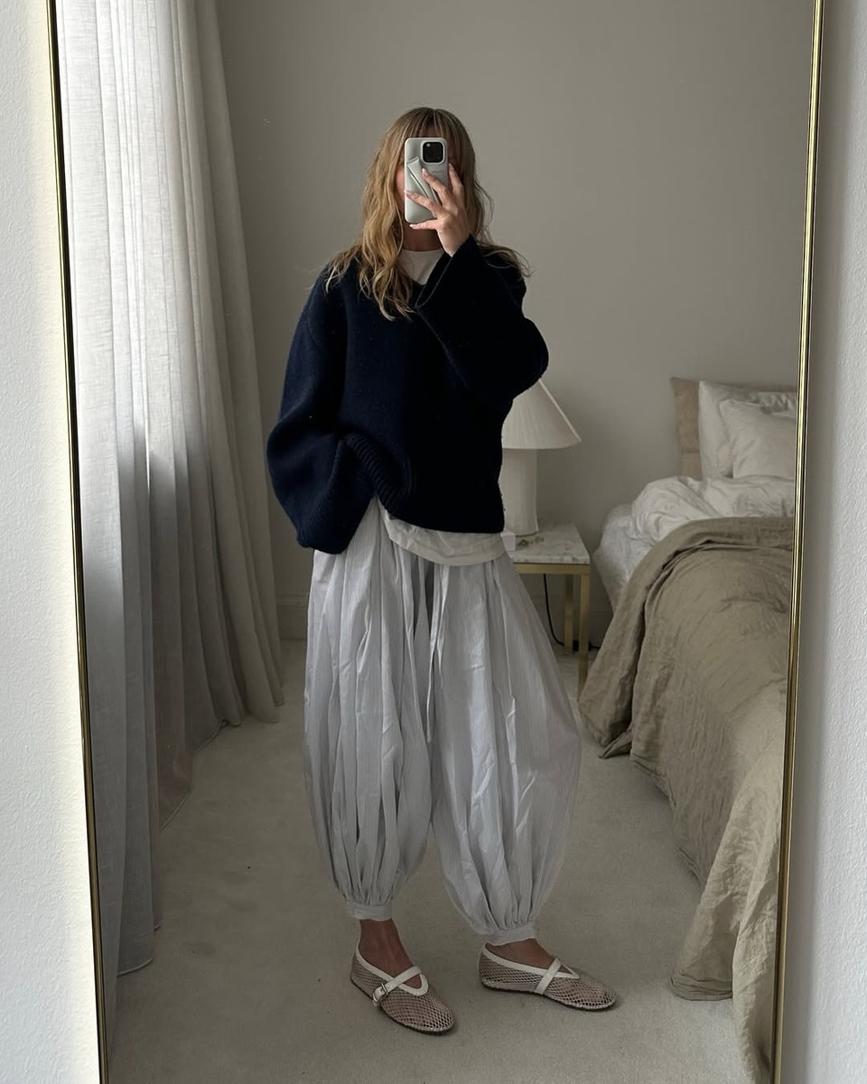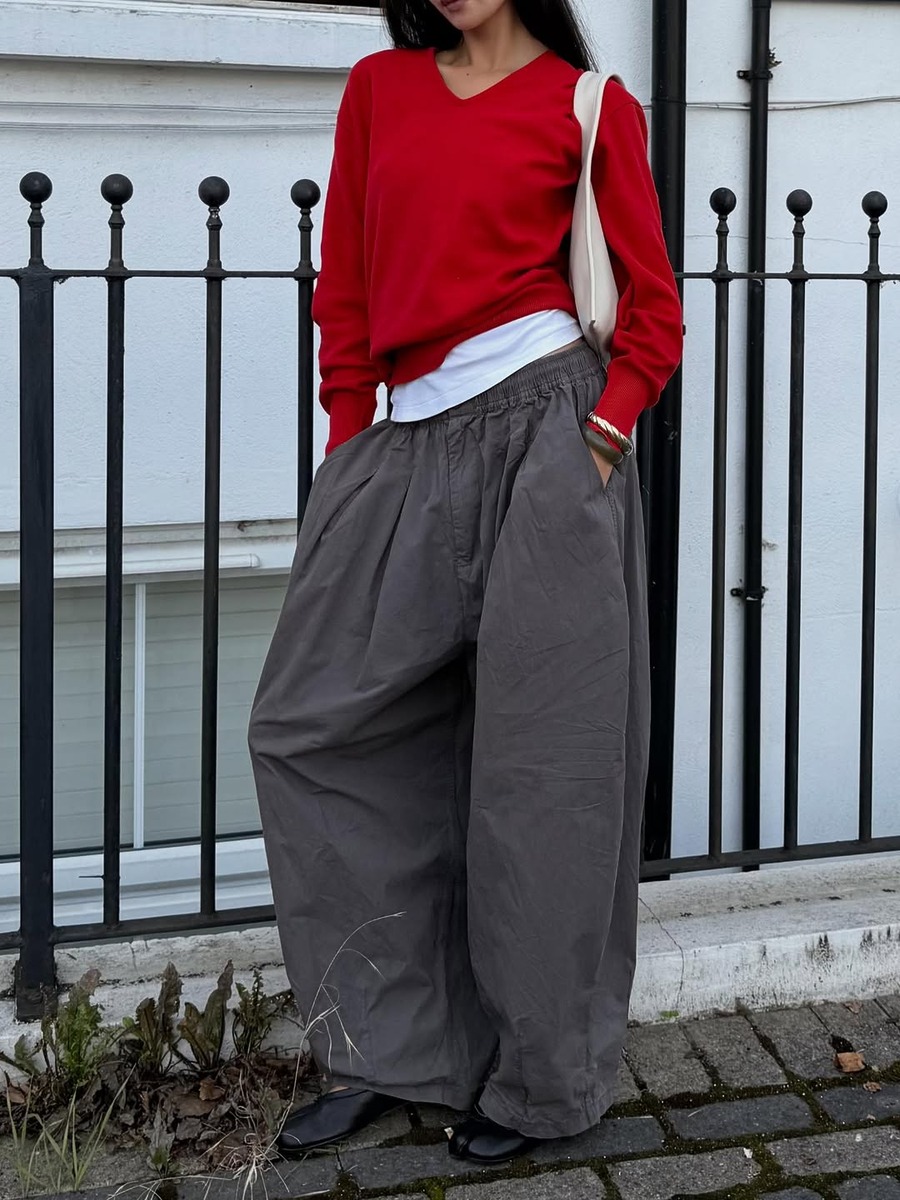 벌룬 팬츠를 더 세련되게 연출하고 싶다면, 바짓단을 신발이나 양말 안으로 살짝 넣어보세요. 둥근 실루엣의 끝을 살짝 잡아주면 전체적인 비율이 정돈되고, 다리 라인도 길어 보입니다. 바짓단을 넣는 것만으로도 단정하면서도 클래식한 인상을 줄 수 있을 거예요.