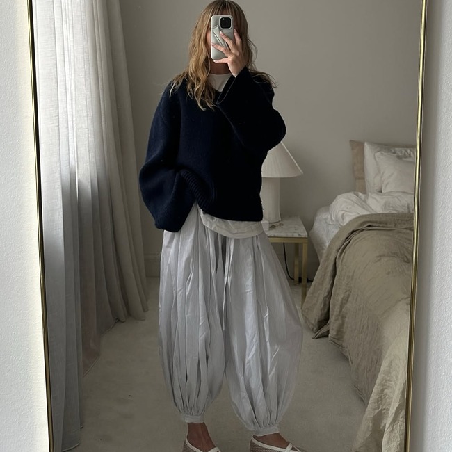 벌룬 팬츠의 매력은 단순한 톱과 함께 할때 극대화됩니다. 기본 니트나 티셔츠도 벌룬 팬츠를 만나는 순간 세련되고 우아하게 변신하죠. 곡선형 실루엣의 팬츠가 전체적인 분위기를 잡아주기 때문에 과한 디테일이 없어도 충분히 완성도 있는 스타일링이 가능하다는 것이 가장 큰 장점!