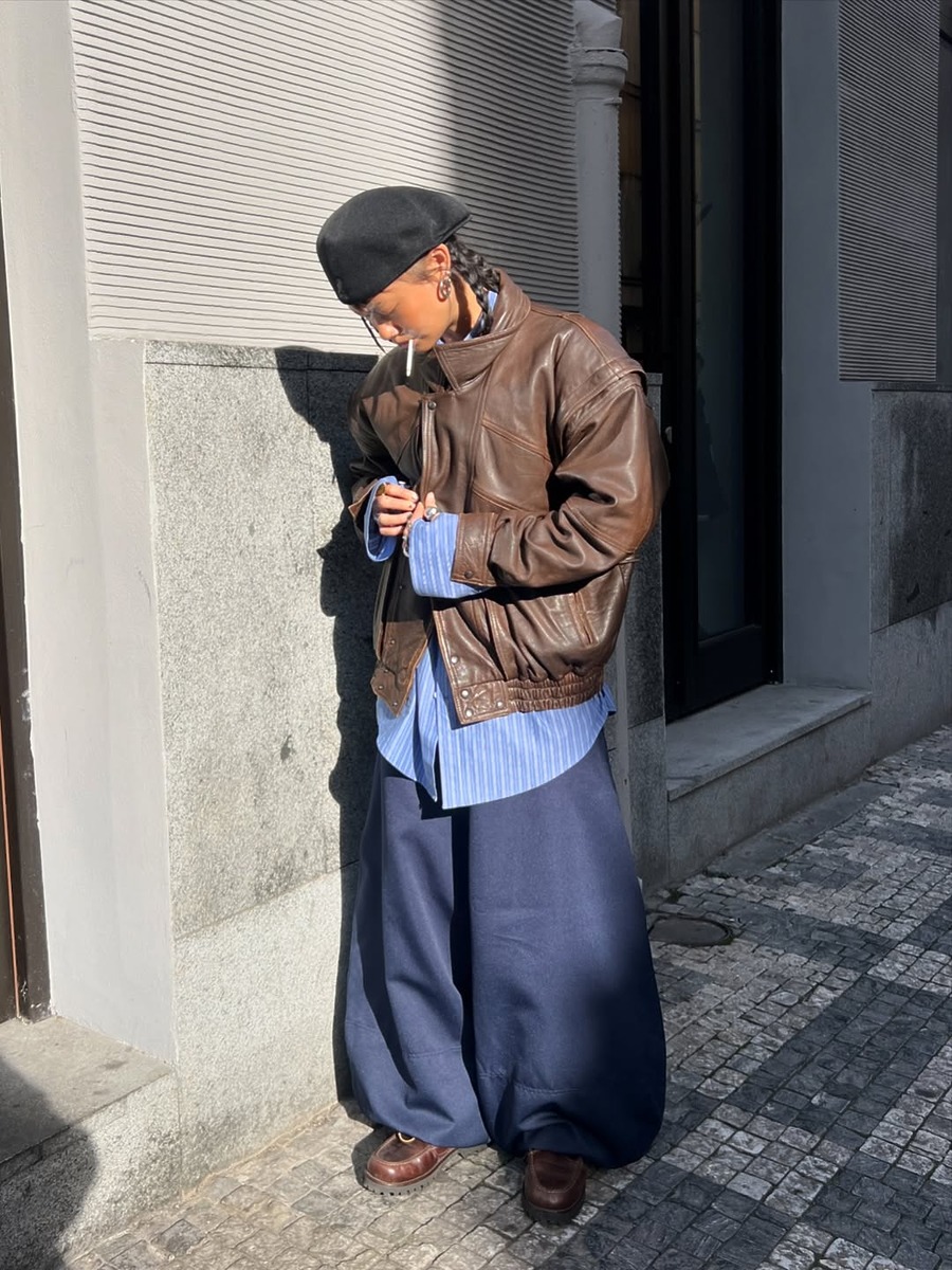 밑단으로 갈수록 둥글게 좁아지는 벌룬팬츠는 스트레이트 팬츠보다 훨씬 부드럽고 여유로운 인상을 줍니다. 네이비 벌룬 팬츠에 스트라이프 셔츠, 브라운 레더 재킷을 매치한 룩처럼 루즈한 아이템을 함께 매치하면 시크하면서도 여유로운 무드를 완성할 수 있죠.