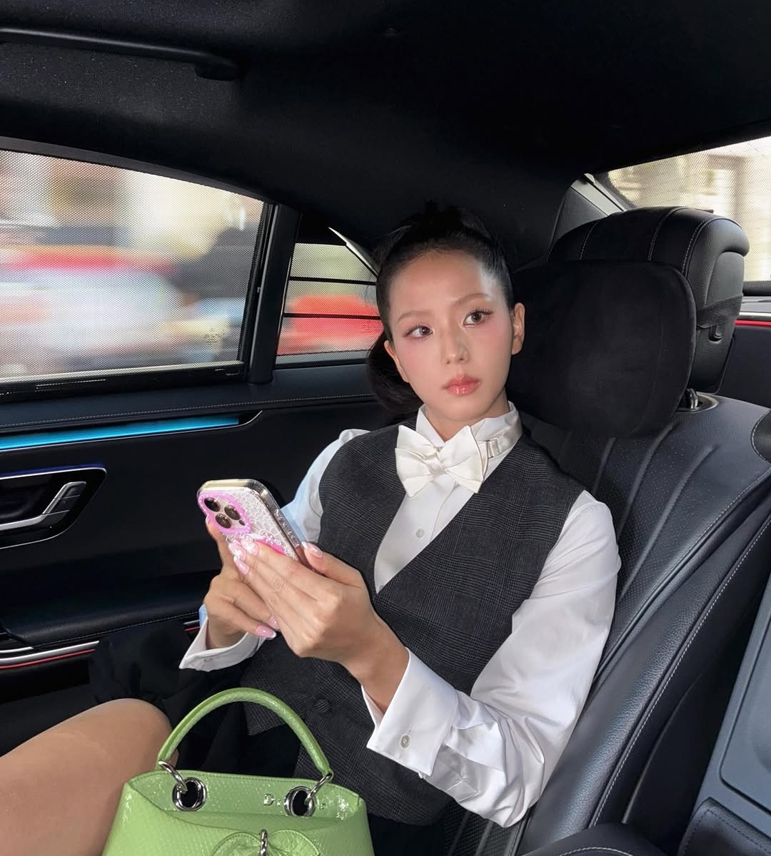 지수는 평범한 넥타이 대신 클래식한 보 타이를 선택했어요. 그레이 베스트 위에 나비넥타이를 더하고 그린 백으로 포인트를 준 그녀의 스타일은 포멀하면서도 사랑스러운데요. 큰 사이즈의 보 타이는 얼굴을 작아 보이게 만들어 주는 건 물론, 단정한 룩에 위트를 더하기 좋아 의외로 실용적인 아이템이랍니다.