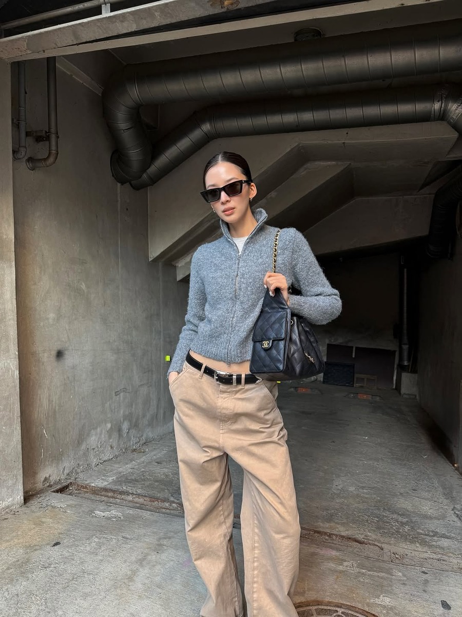강민경이 선택한 골지 니트 집업은 몸선을 슬림하게 잡아줘 슬림한 부츠컷 데님과 완벽한 균형을 이룹니다. 가을에는 단독으로, 겨울에는 아우터 안에 레이어드해 입기 좋으니 실용성은 두말할 것 없고요. 카키 컬러가 어느 스타일에도 자연스럽게 녹아 들어 완성도 높은 레이어드 룩을 연출할 수 있어요.
