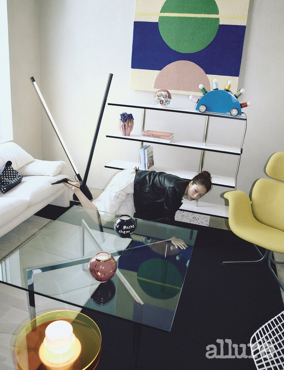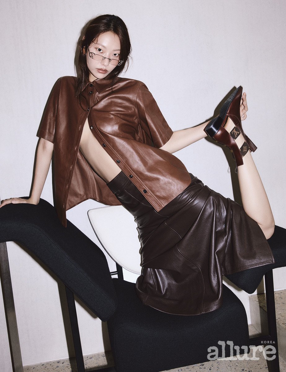 램스킨 소재 하프 슬리브 셔츠와 맥시스커트는 페라가모(Ferragamo). 카프스킨 소재 첼시부츠는 루이비통(Louis Vuitton). 무테 안경은 프라다(Prada).