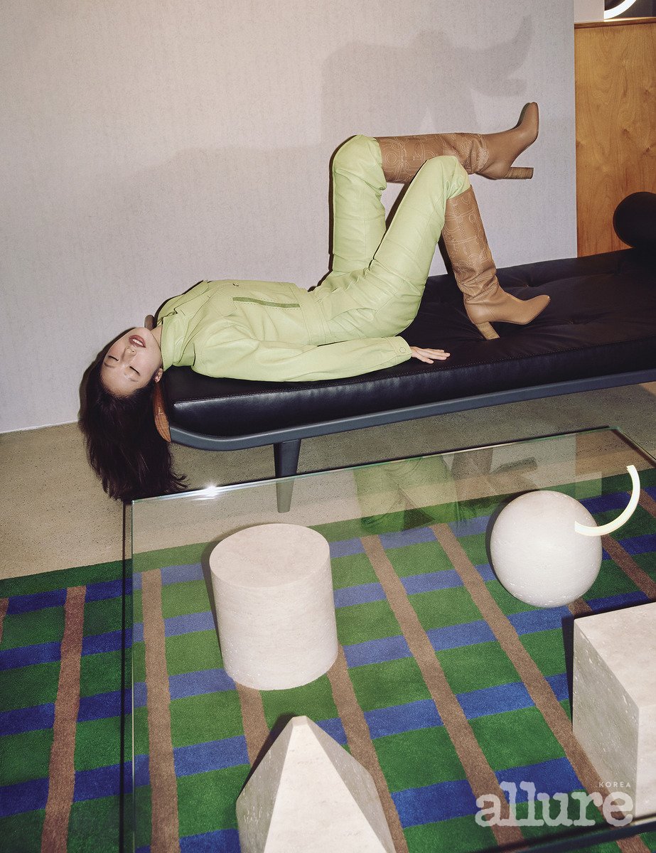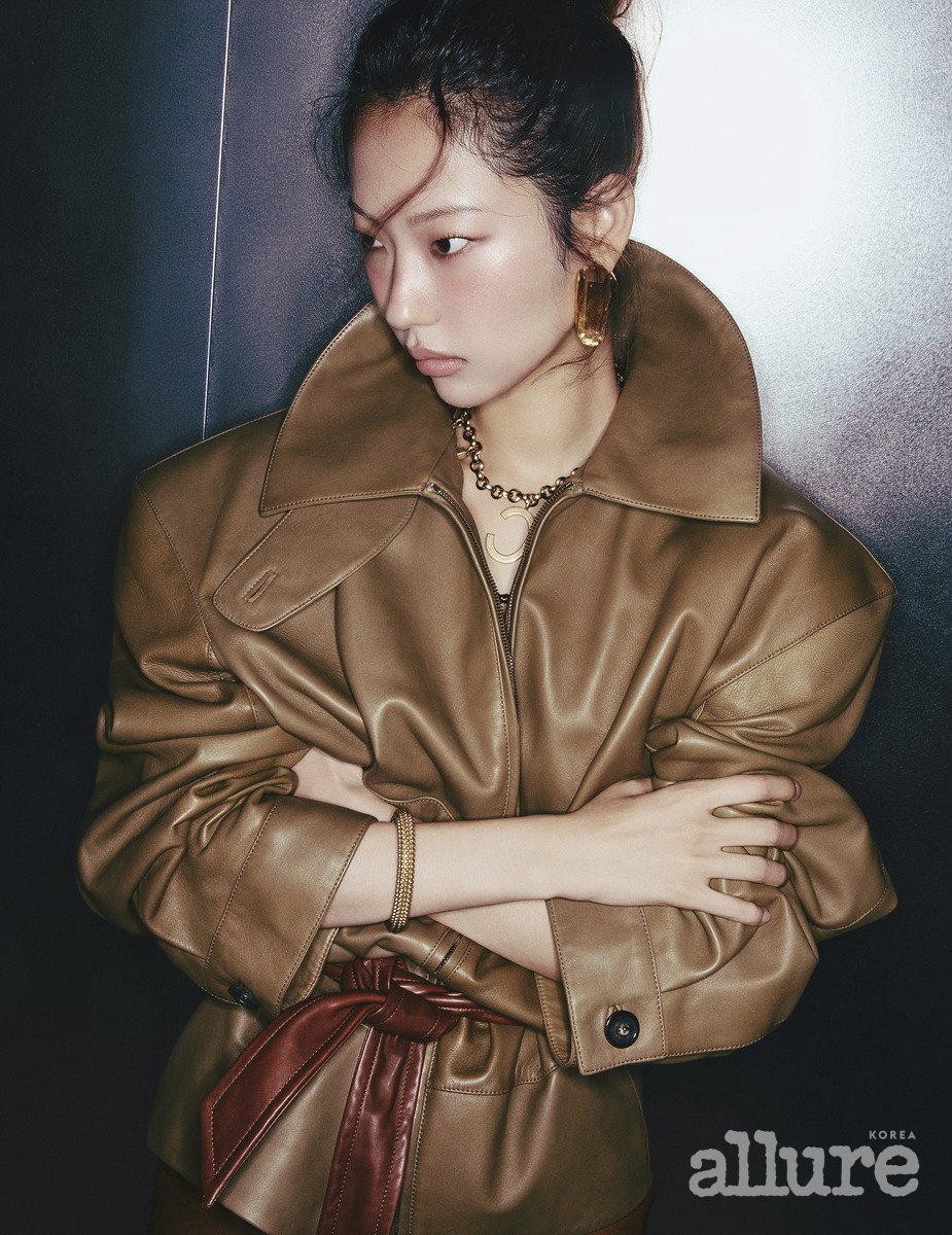 대담한 어깨 라인을 강조한 램스킨 소재 로웨이스트 재킷, 오벨리스크 이어링은 생 로랑 바이 안토니 바카렐로. 네크리스로 연출한 체인 벨트는 끌로에. 비즈 장식의 골드 도금 브라스와 팔라듐 소재 뱅글은 아미(Ami).