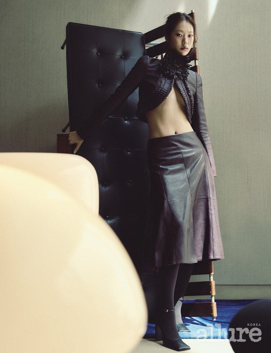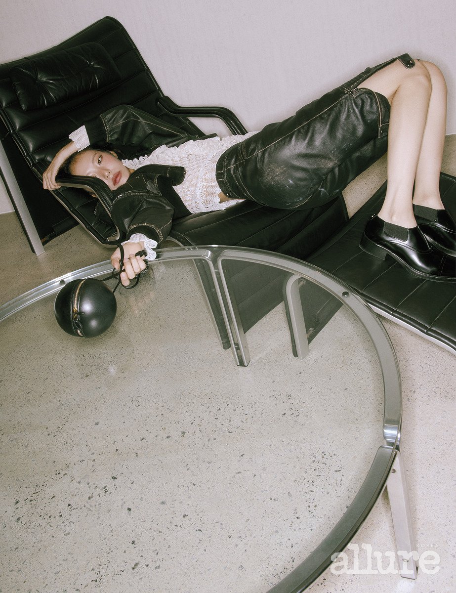 ‘플롱제’ 램스킨 소재 오버 핏 재킷은 케이트(Khaite). 벗겨진 듯한 디테일로 소가죽의 거친 질감을 살린 스커트는 프라다. 페이턴트 레더 소재 스틸레토 힐은 생 로랑 바이 안토니 바카렐로(Saint Laurent by Anthony Vaccarello).