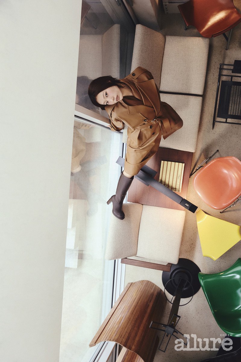 램스킨 소재 트렌치코트, 카프스킨 소재 롱부츠는 토즈(Tod’s).