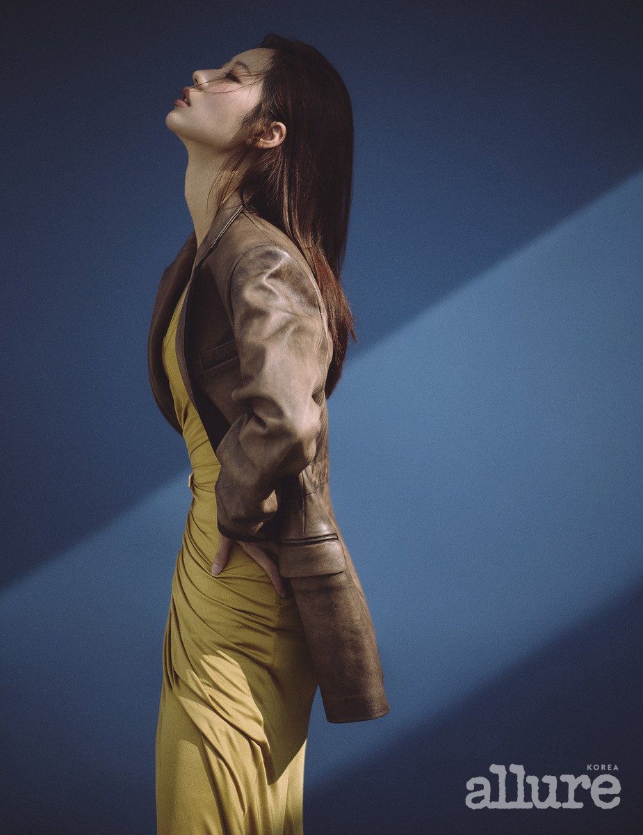 디스트레스 기술로 빈티지한 질감을 살린 소가죽 소재 오버 핏 재킷은 골든구스(Golden Goose). 트임과 스트랩 디테일의 원피스는 베르사체(Versace).