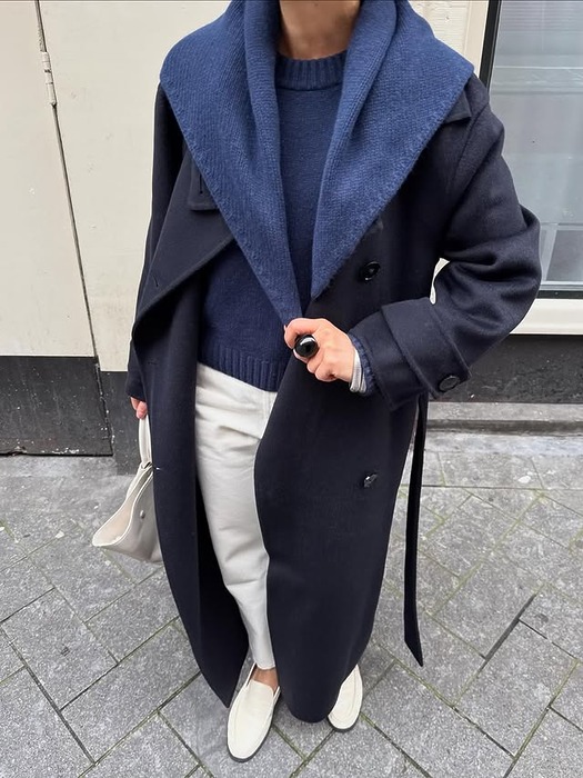 반면 코발트 블루는 특유의 쨍한 색감 덕분에 얼굴 빛을 살리기 좋은데요. 캐주얼한 데님에 스웨이드 롱부츠를 매치하면 이처럼 부드러운 스타일링이 완성됩니다. 이번 시즌, 스웨이드와 코발트 블루의 조합을 잊지 마세요. 때로는 네이비 블루를 화이트와 매치해 보세요. 명도가 높은 화이트는 네이비 블루의 색감을 더욱 명료하고 깨끗하게 표현할 수 있는 컬러죠. 대비감을 살린 룩이 잘 어울린다면 네이비 블루를 기억할 것!