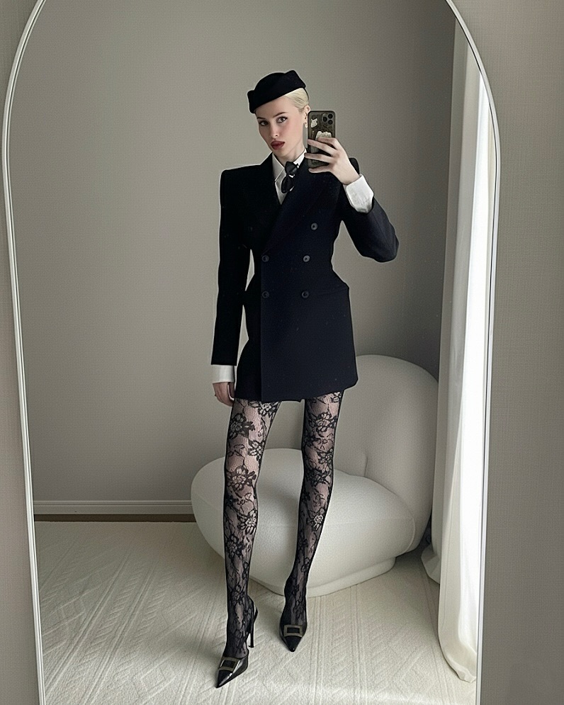 홀리데이 시즌에는 평소 잘 입지 않던 아이템을 과감하게 활용해보세요. 가장 손 쉬운 아이템이 바로 레이스 소재의 스타킹이죠. 미니멀하고 단조로운 스타일도 레이스 스타킹을 더하면 단숨에 드라마틱하게 바뀌니까요. 여성스러움을 드러내고 싶거나, 색다른 스타일로 기분 전환을 하고 싶다면 이런 과감한 아이템을 활용해보세요.