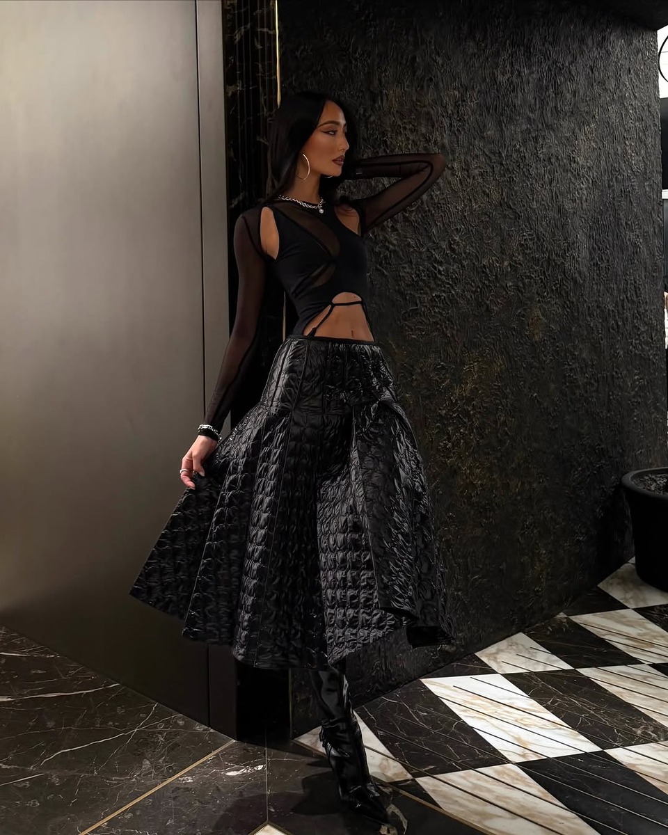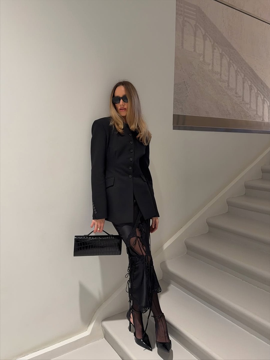 겨울철이면 옷장 속에서 가장 높은 비율을 차지하는 컬러는 역시 블랙이죠. 올블랙 스타일링을 할 때 밋밋함을 없애려면 강력한 한 방이 필요해요. 슬릿 디테일의 블라우스, 도톰한 부피감이 특징인 패딩 스커트, 리본 장식의 롱 스커트 등으로 말이에요. 이런 포인트가 없는 블랙 룩은 단조롭고 몰개성해 보일 수 있죠. 옷을 블랙 컬러로 통일했다면 클러치나 구두에 컬러 포인트를 주거나 볼드한 주얼리를 하는 식으로 스타일에 리듬감을 부여하는 것도 좋은 방법이에요.
