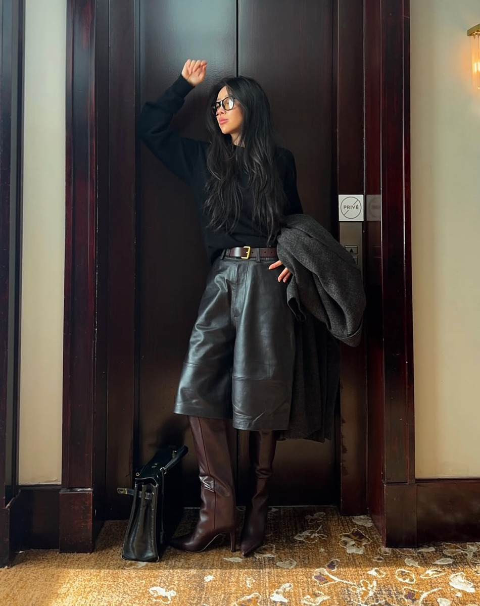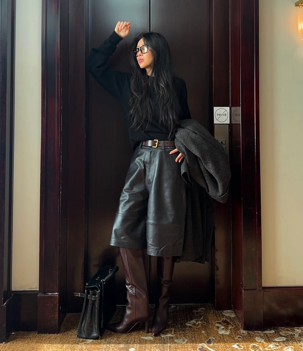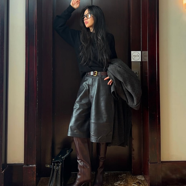 가죽 소재 버뮤다 팬츠는 이번 FW 시즌, 빼놓을 수 없는 아이템이죠. 날씨가 추워지면 롱부츠를 매칭해보세요. 컬러가 다른 가죽 아이템들의 조합은 가장 손쉽게 스타일 감도을 높일 수 있는 스킬이죠. 함께 매치하는 아이템은 블랙으로 통일해 스타일링의 밸런스를 맞춰주는 센스도 놓치지 마세요!