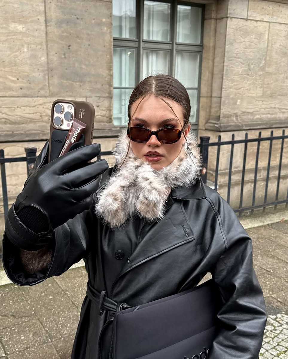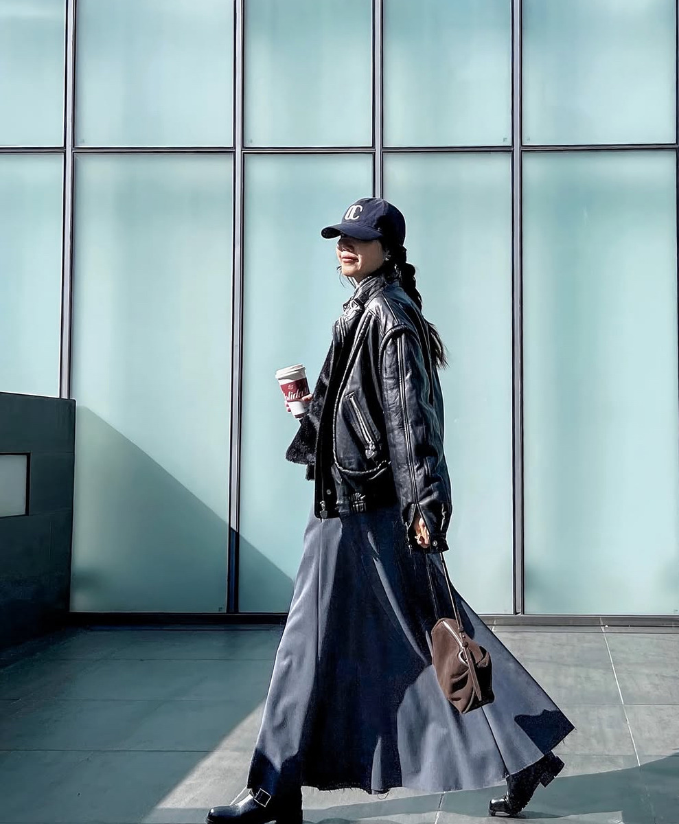 실루엣이 간결한 블랙 롱 코트에 퍼 머플러만 더해줘도 단숨에 겨울 느낌 낭낭한 윈터 레더 룩을 연출할 수 있죠. 가죽 장갑, 선글라스 등 시크한 무드를 얹어줄 아이템들을 추가로 매치하면 카리스마 넘치는(?!) 스타일링 완성!