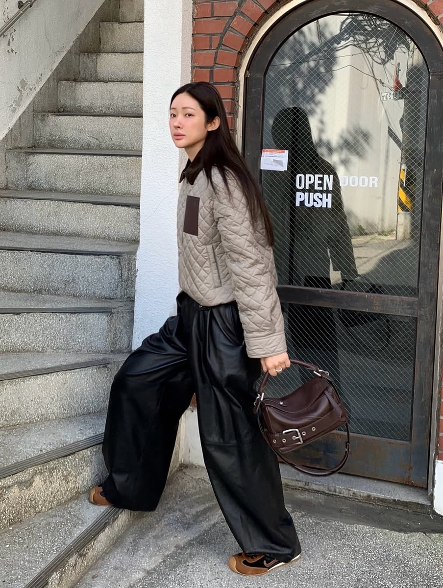 사실 가죽의 진짜 매력은 그 어떤 투박한 아이템이라도 단숨에 스타일 감도를 끌어올려 준다는 것이죠. 차정원이 선택한 것 같은 젠틀한 감성의 경량 패딩에도 적용되는 공식이랍니다. 아우터를 상의처럼 연출한 후, 레더 와이드 팬츠를 매칭해보세요. 시크한 가죽 백과 스니커즈를 더하면 그 효과는 배가되죠.